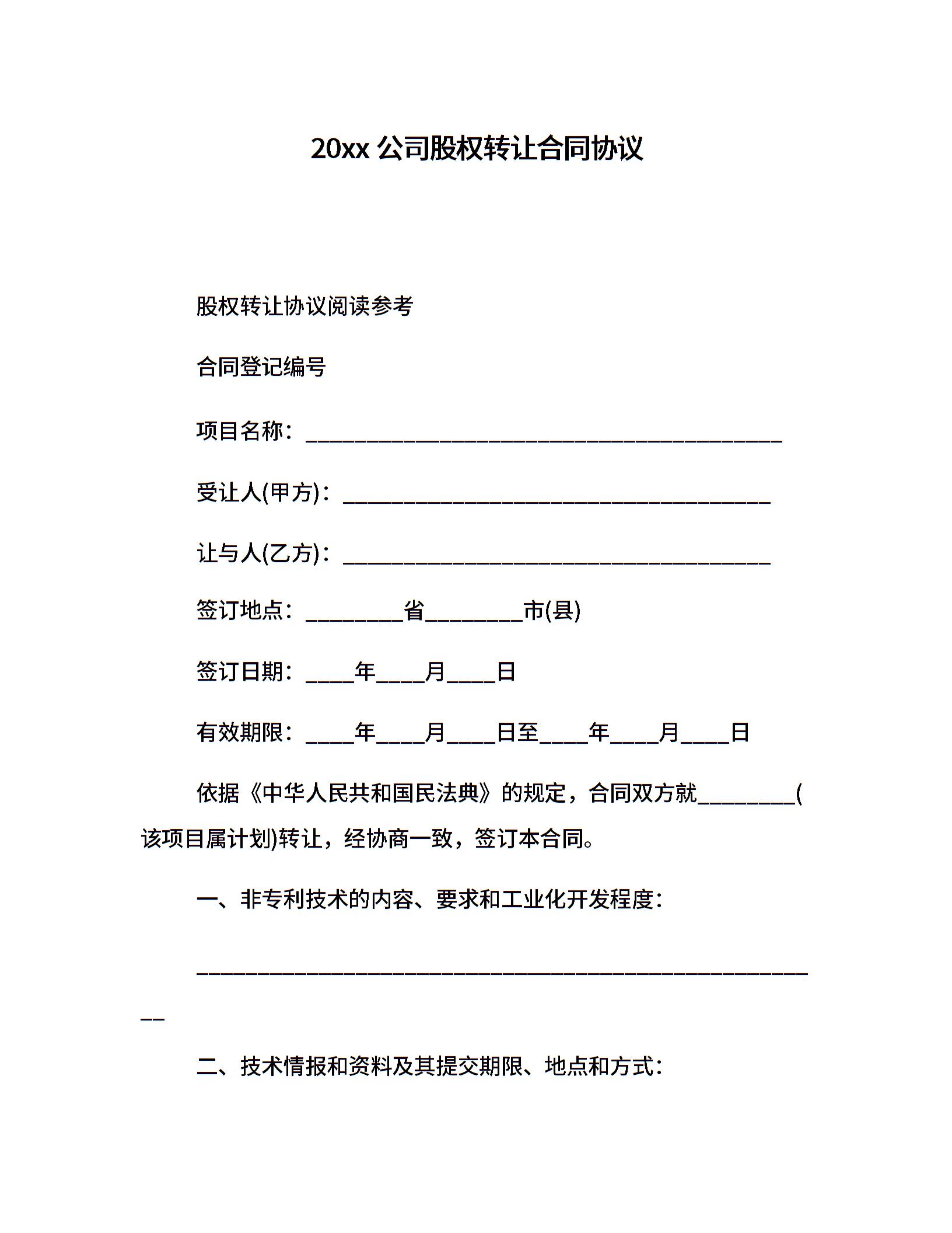 20xx公司股权转让合同协议