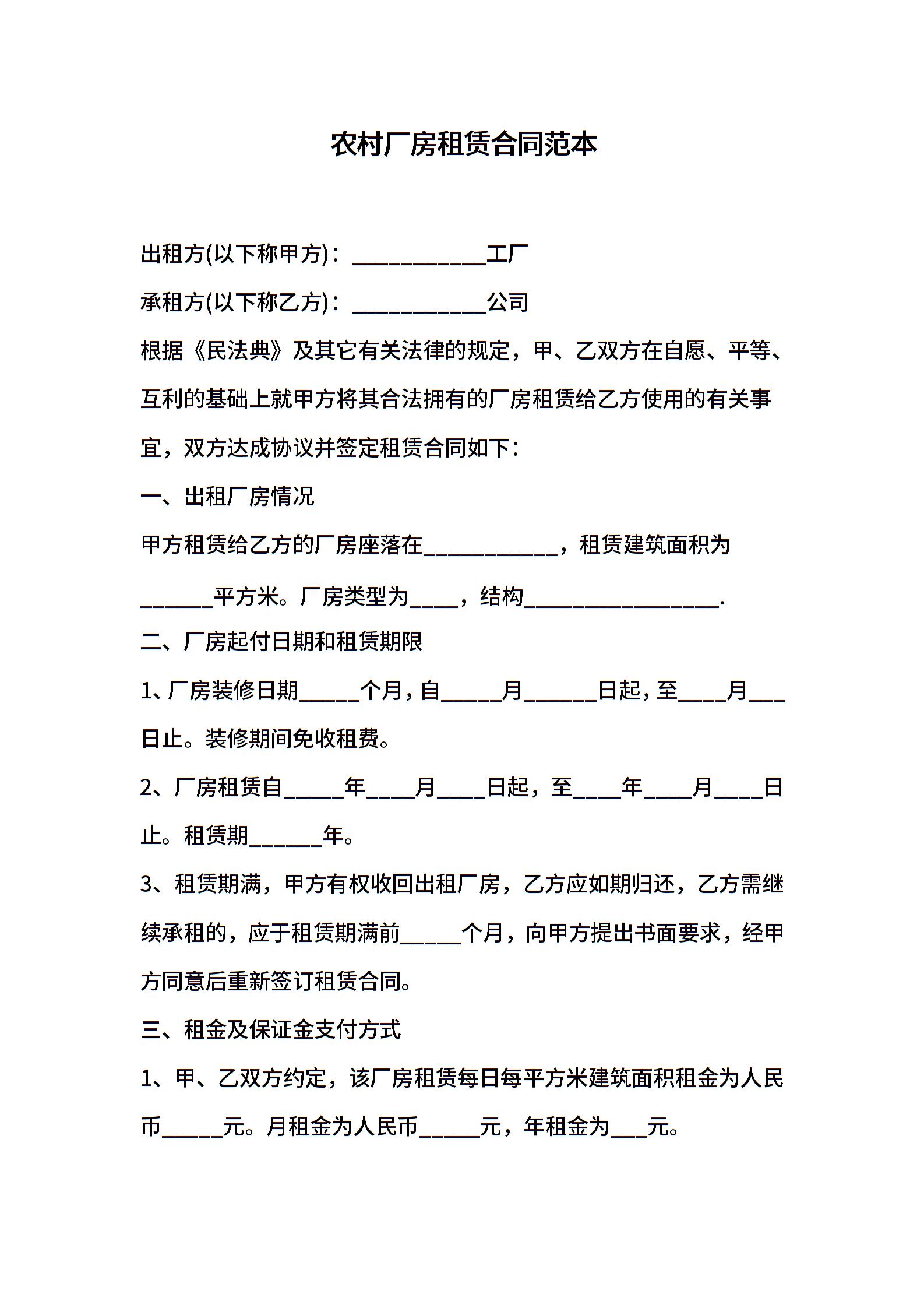 农村厂房租赁合同范本