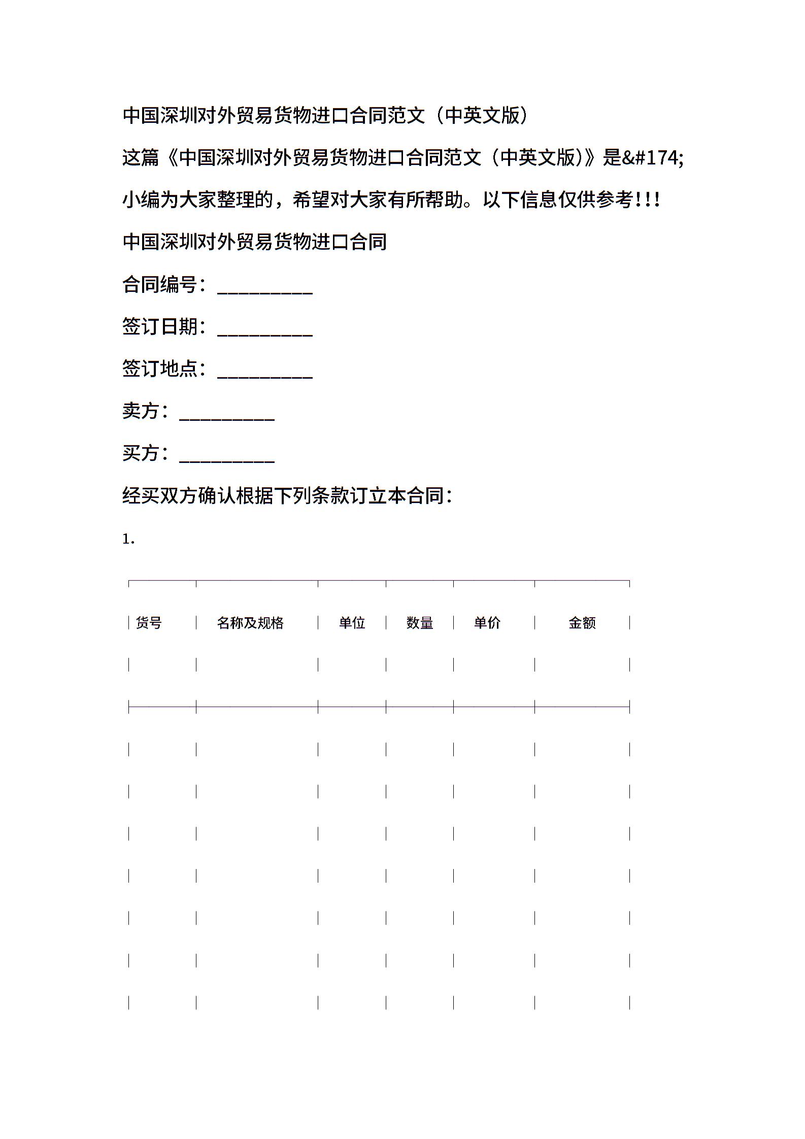 中国深圳对外贸易货物进口合同范文(中英文版)