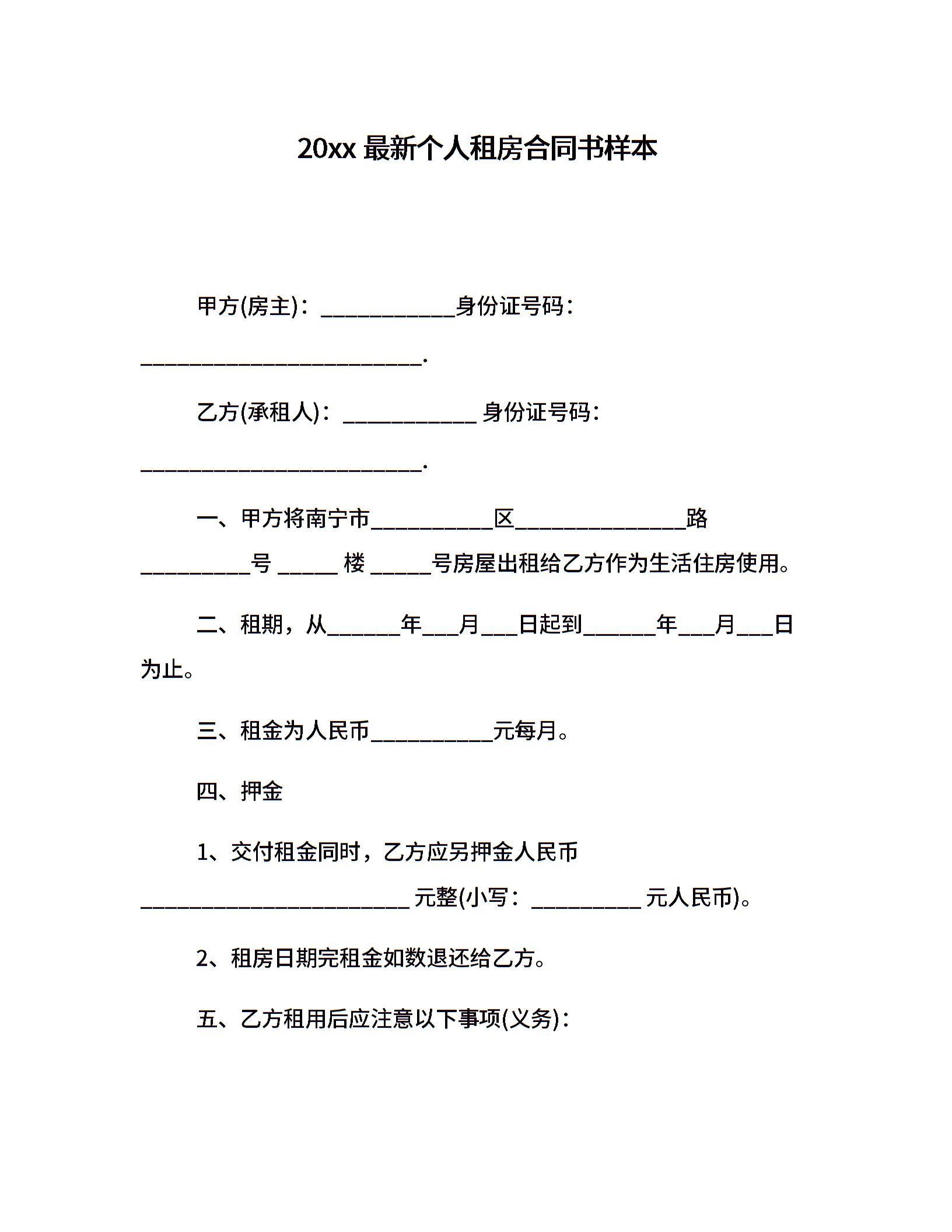 20xx最新个人租房合同书样本