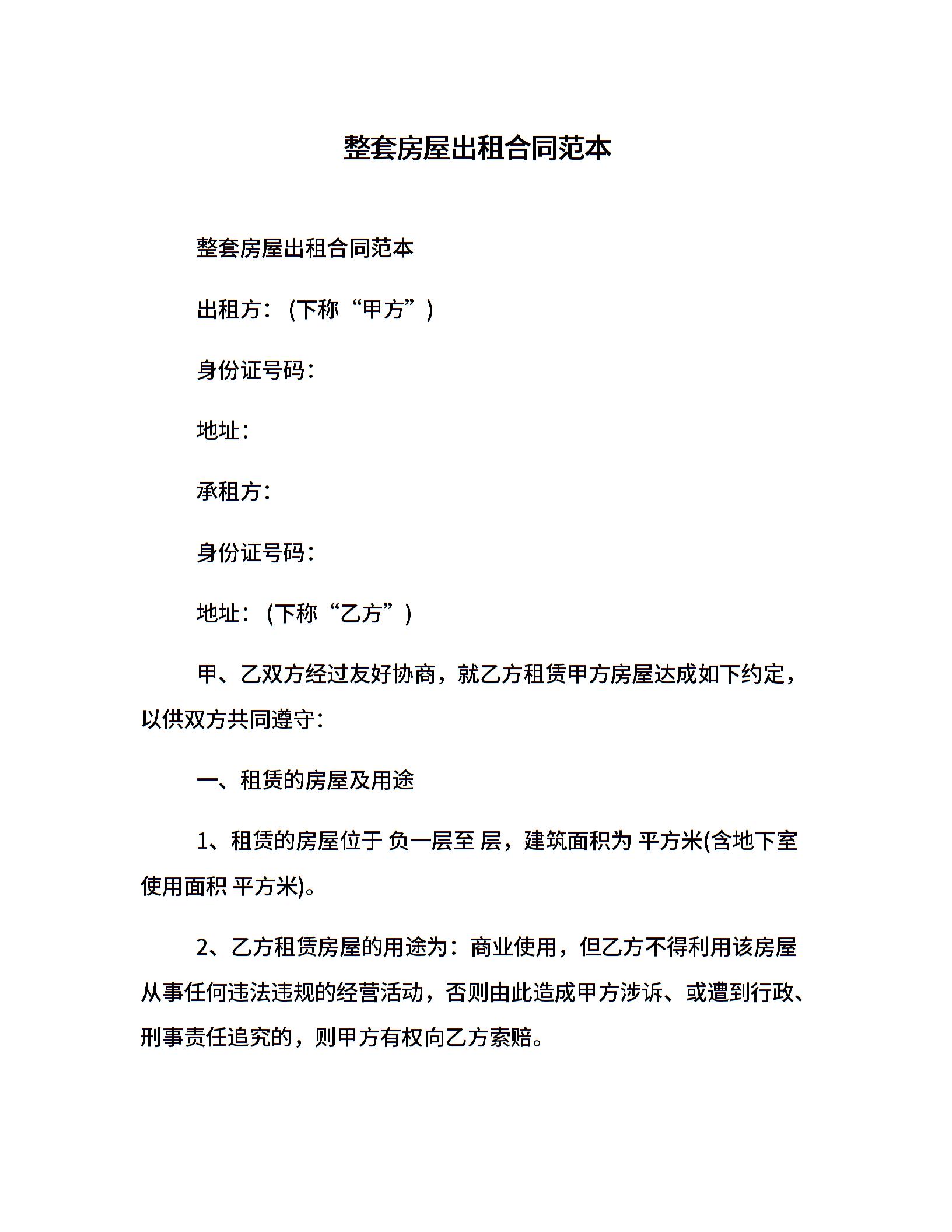 整套房屋出租合同范本