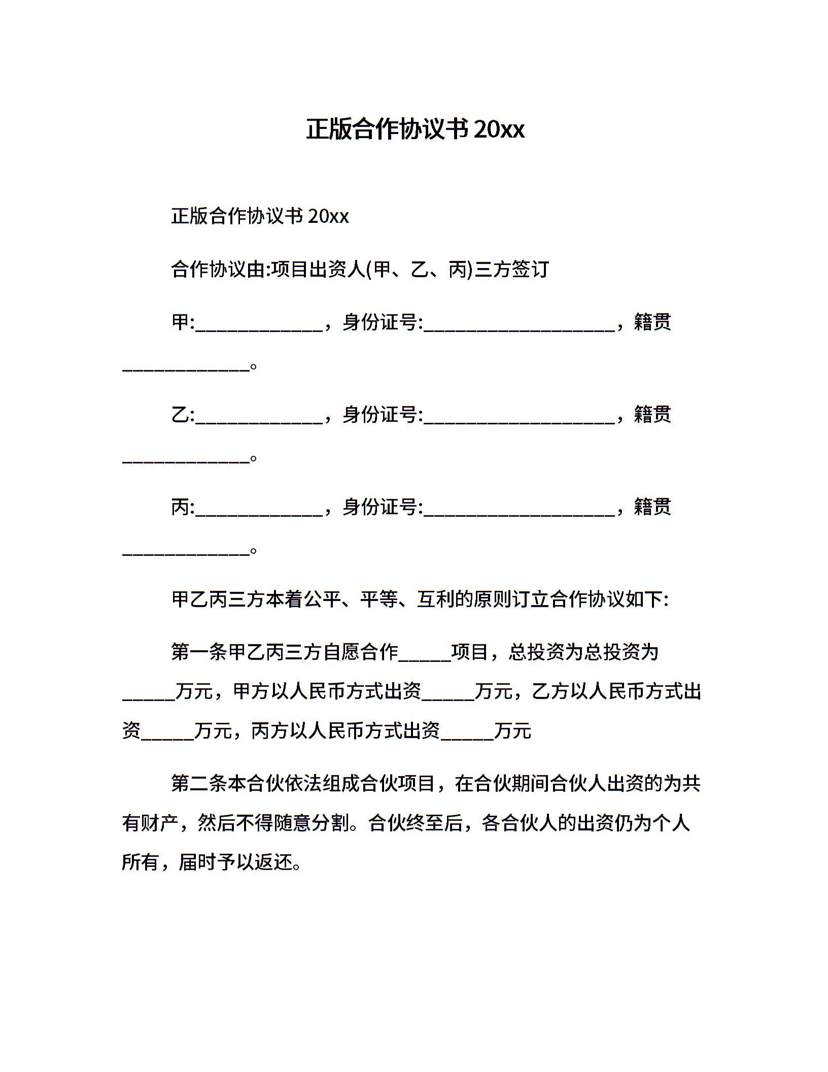 正版合作协议书20xx
