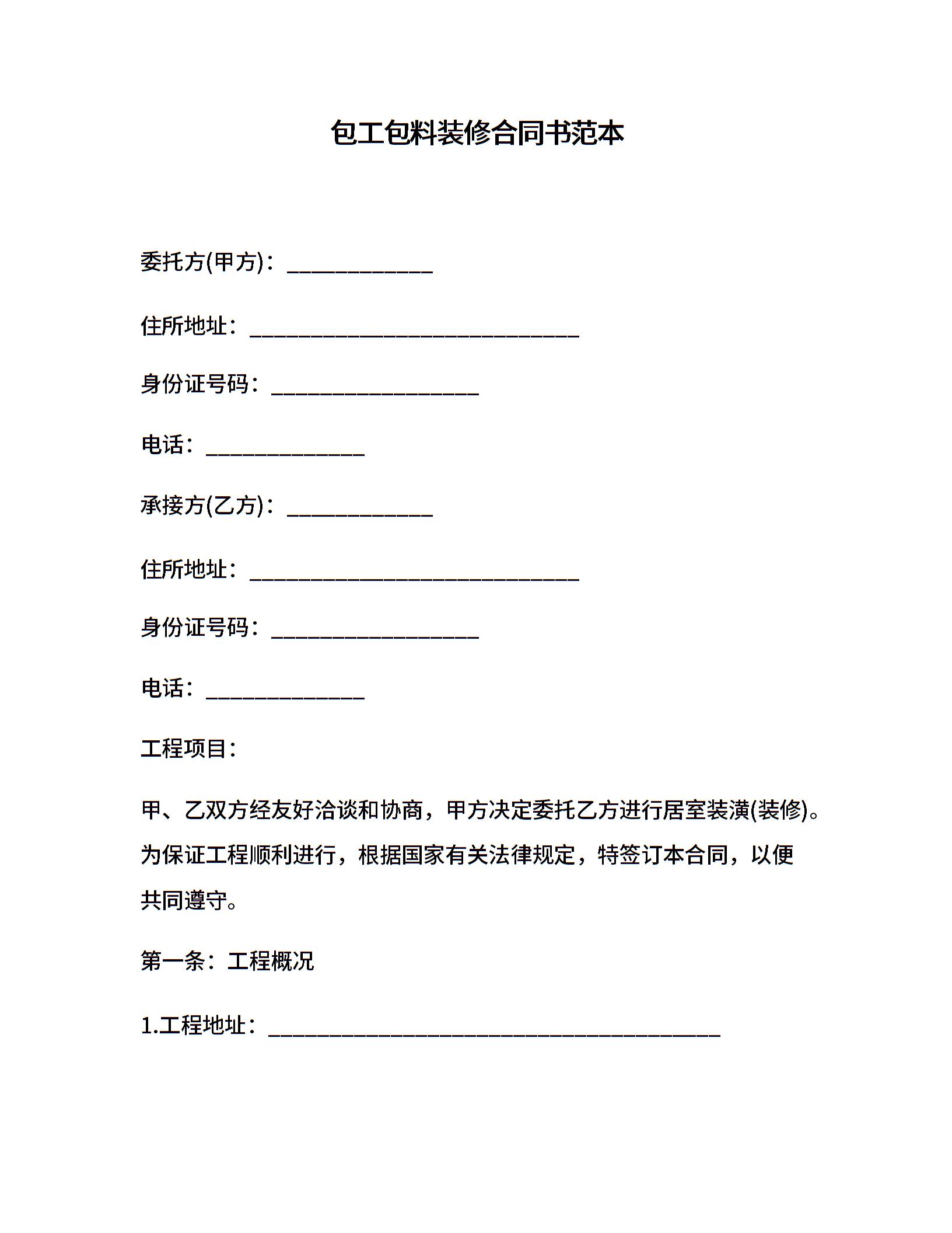 包工包料装修合同书范本