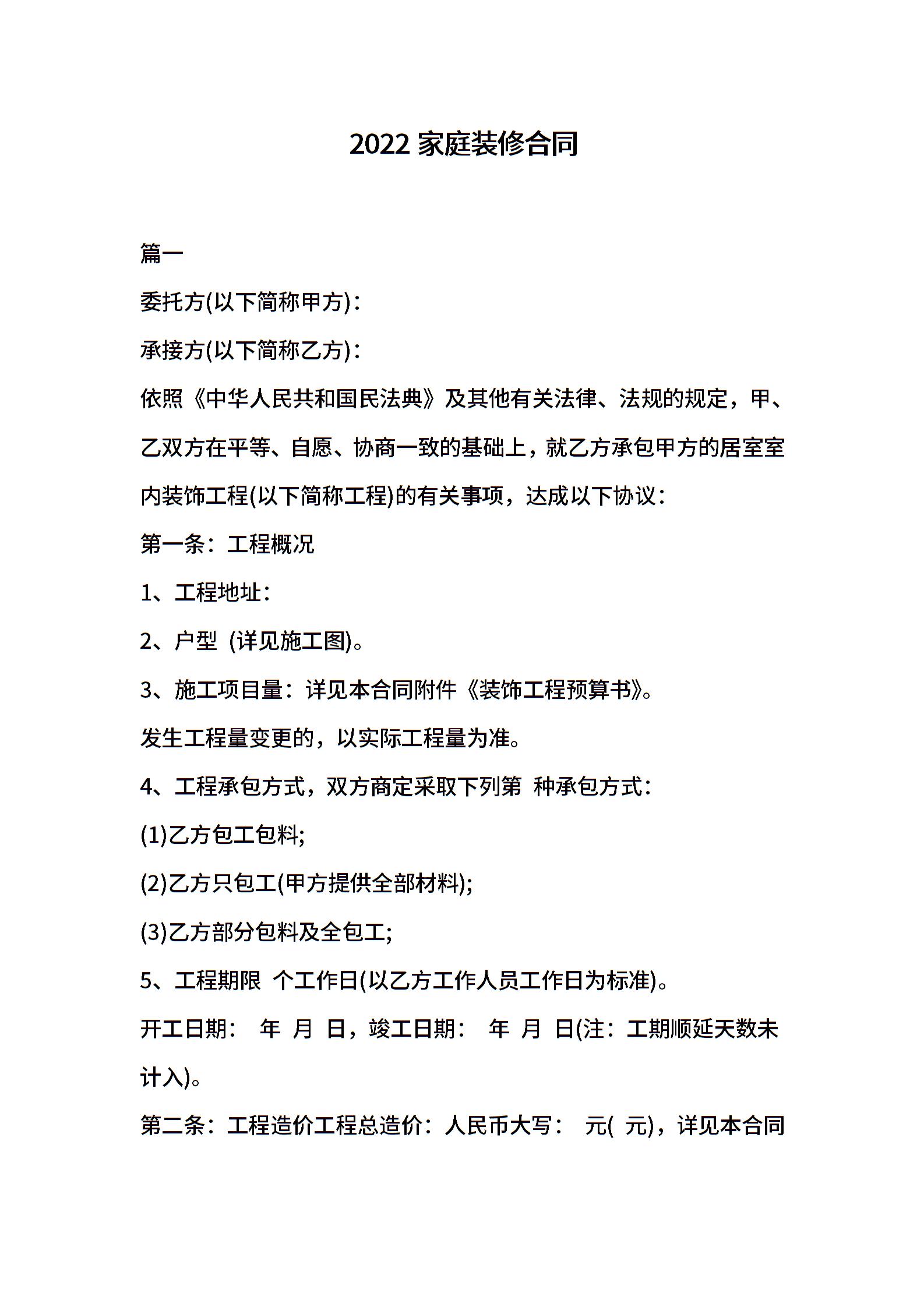 2022家庭装修合同