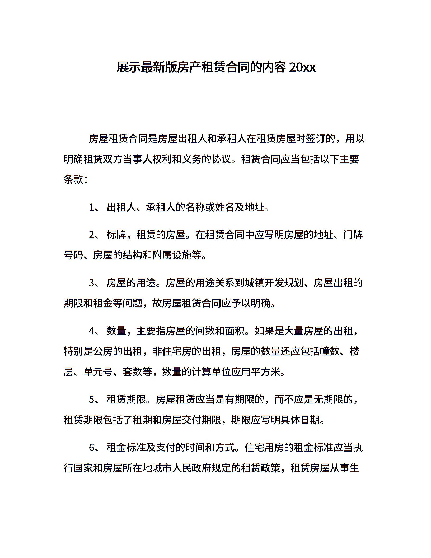 展示最新版房产租赁合同的内容20xx