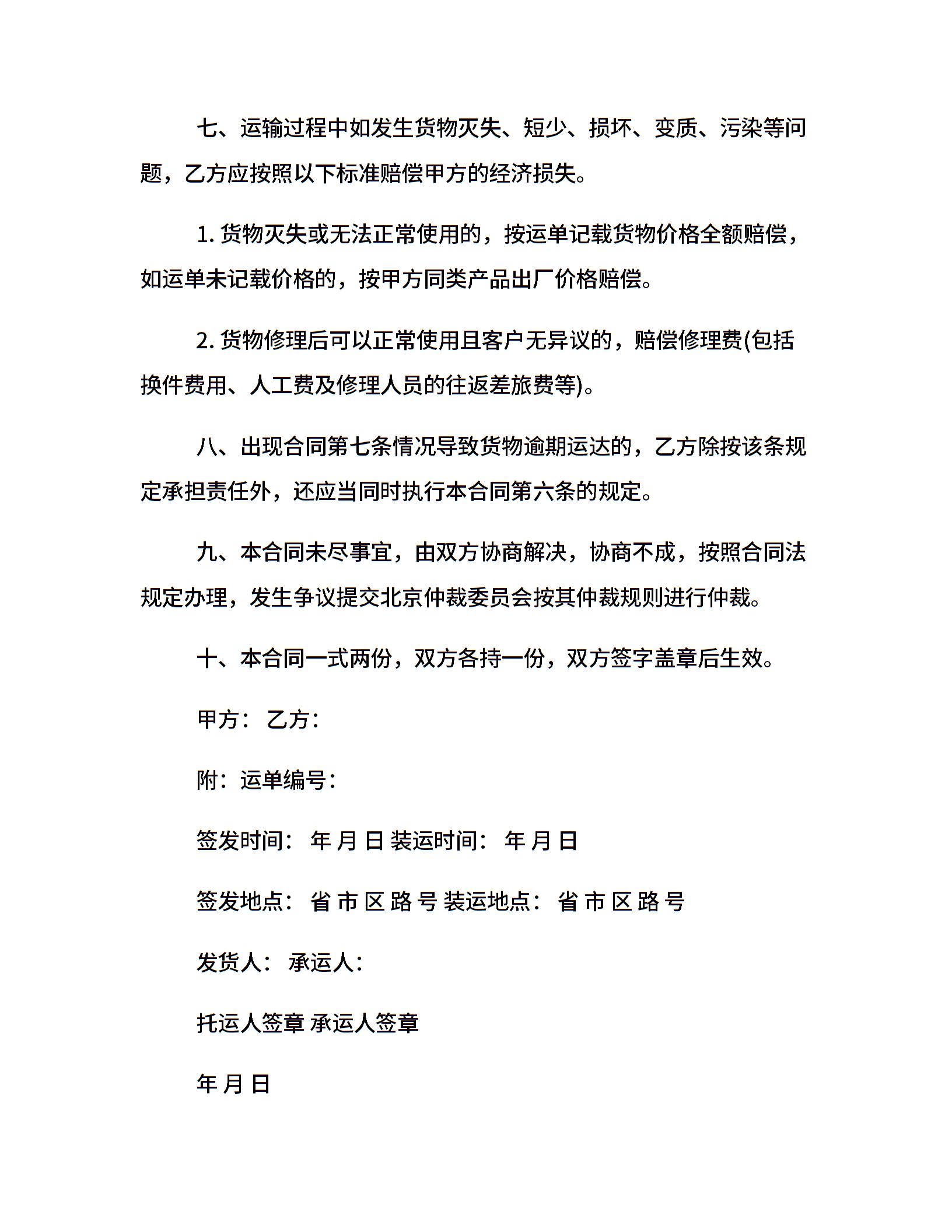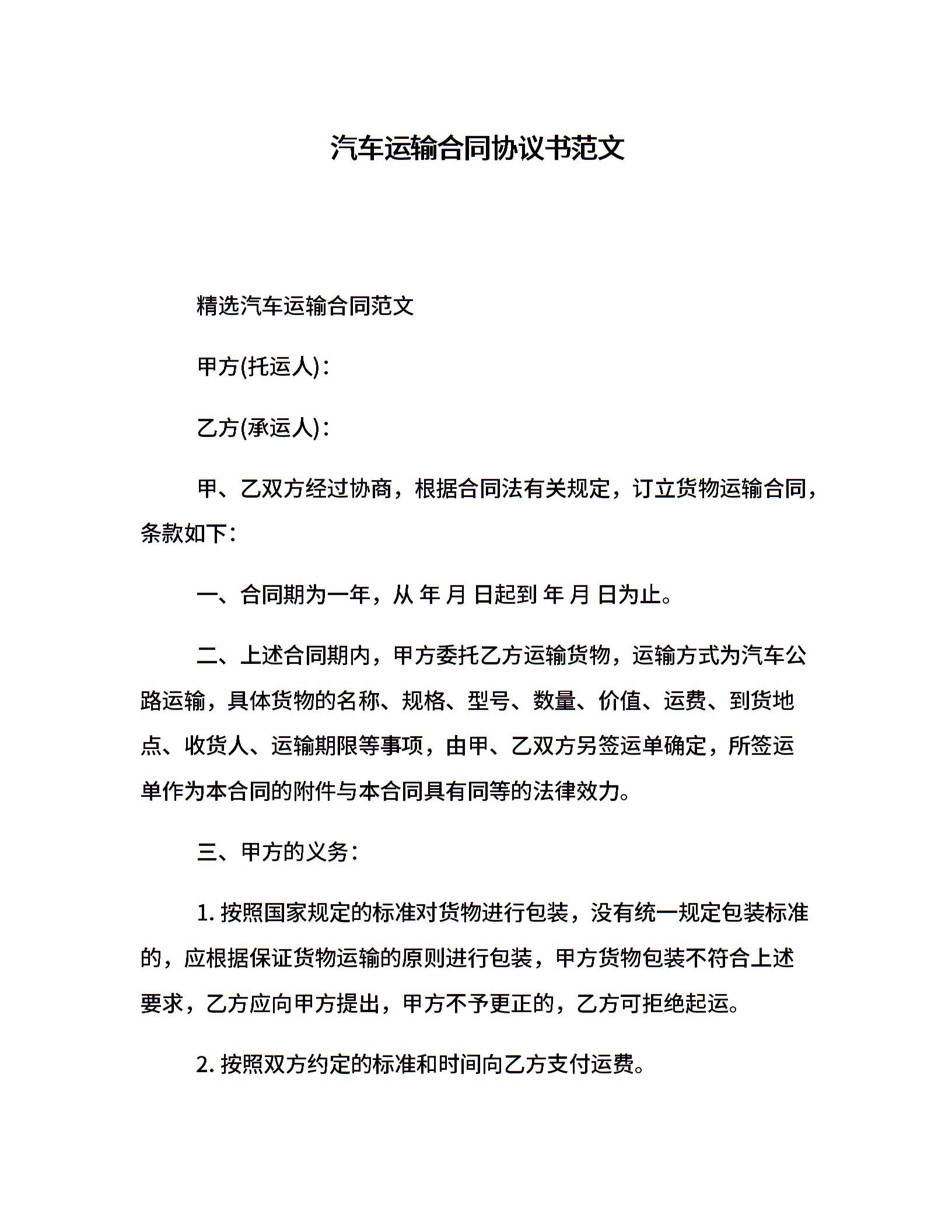 汽车运输合同协议书范文