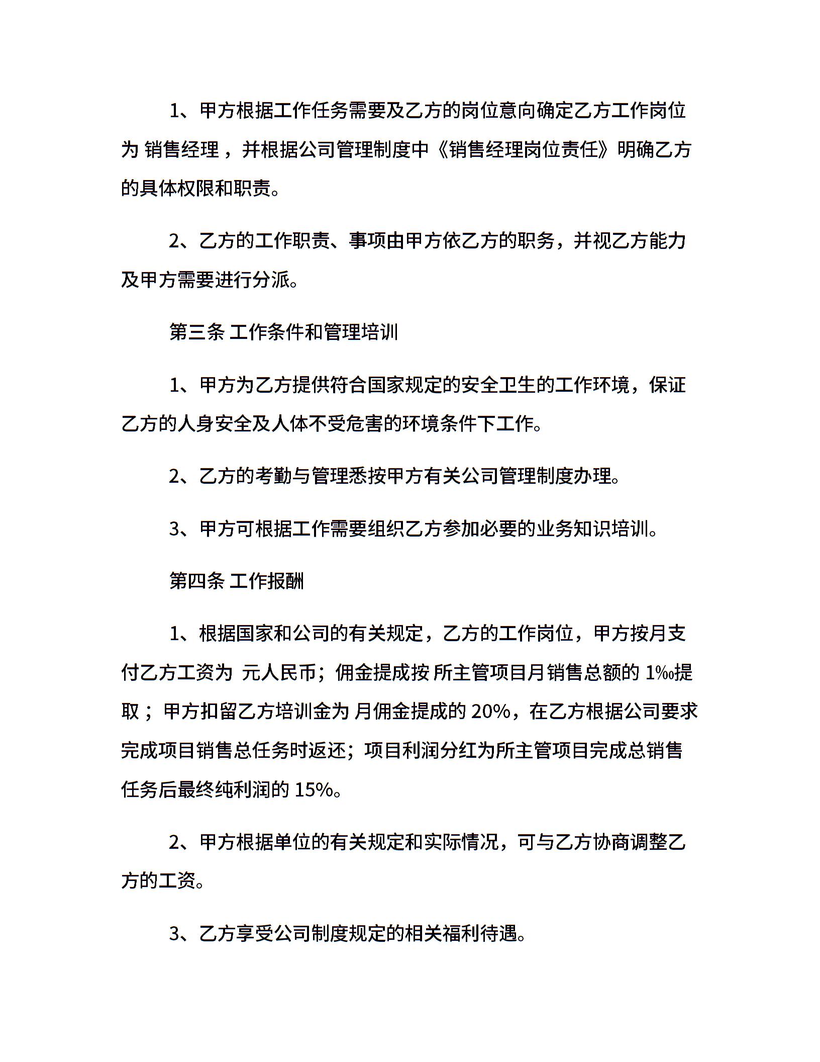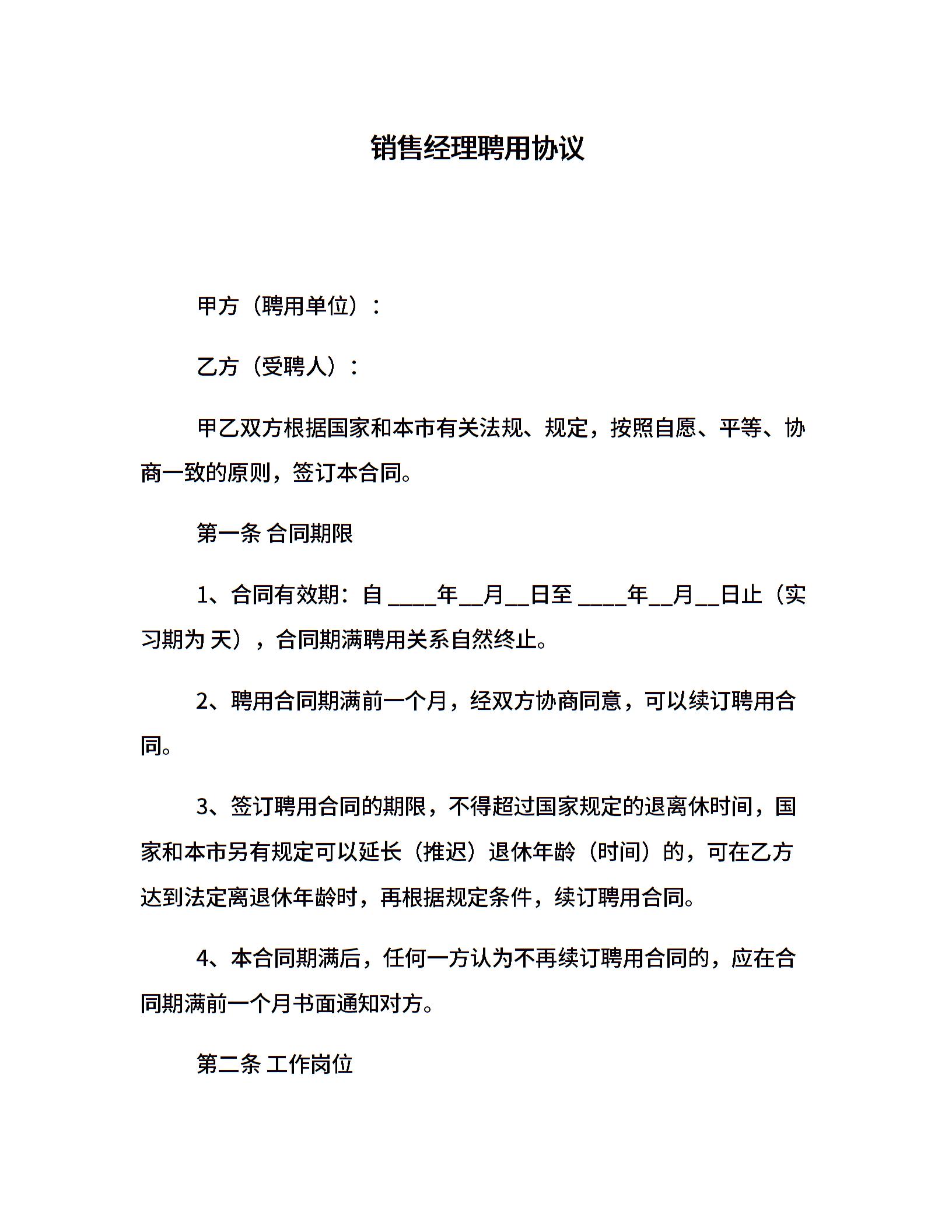 销售经理聘用协议