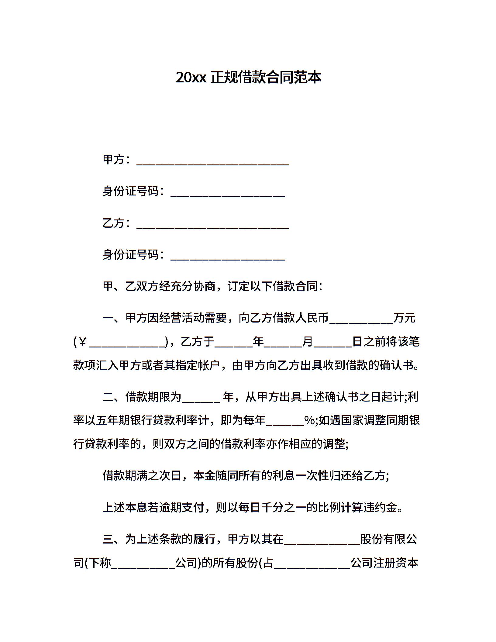 20xx正规借款合同范本