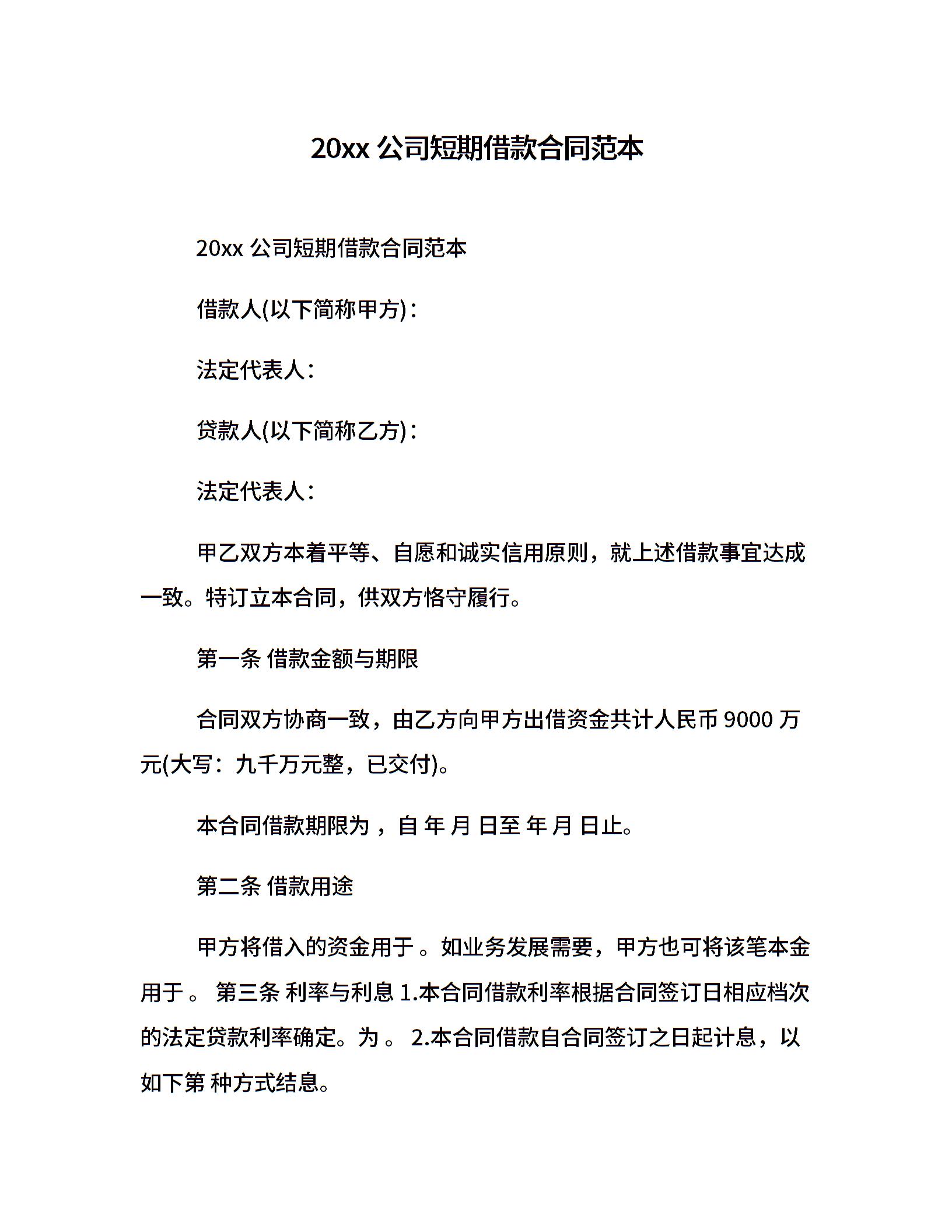 20xx公司短期借款合同范本