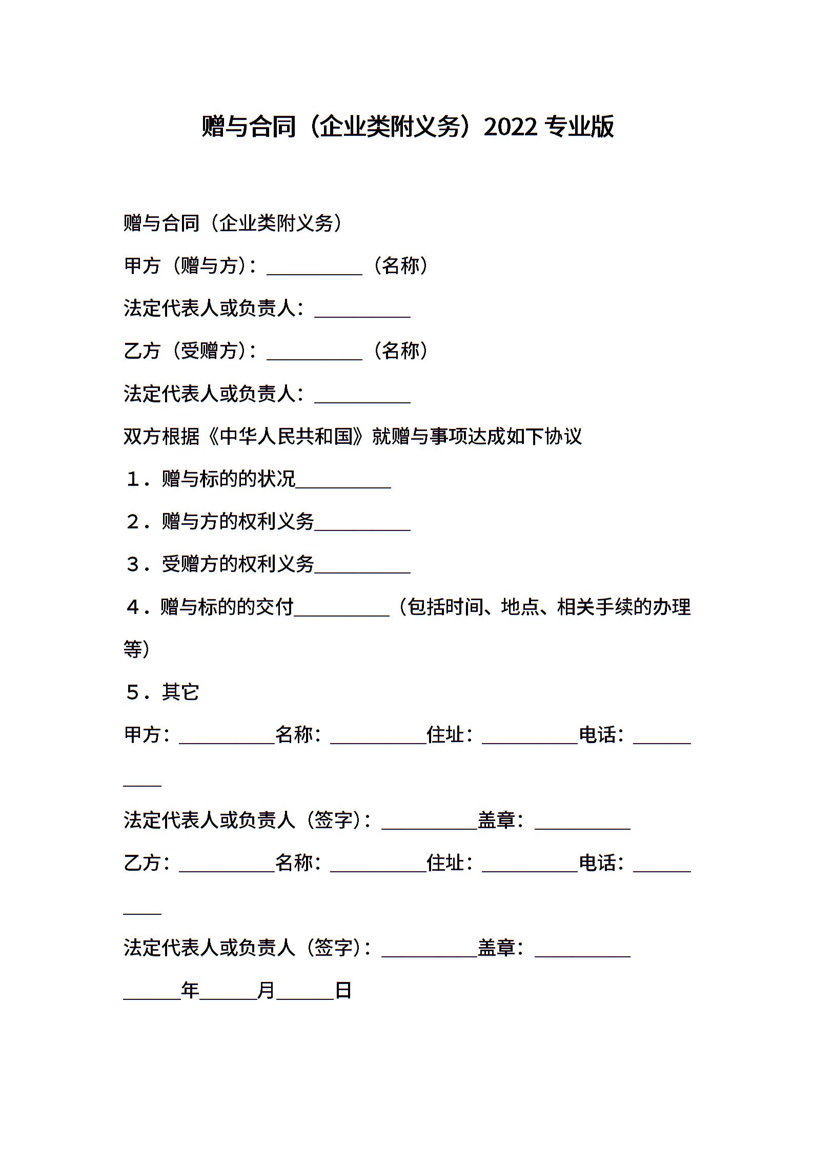 赠与合同(企业类附义务)2022专业版