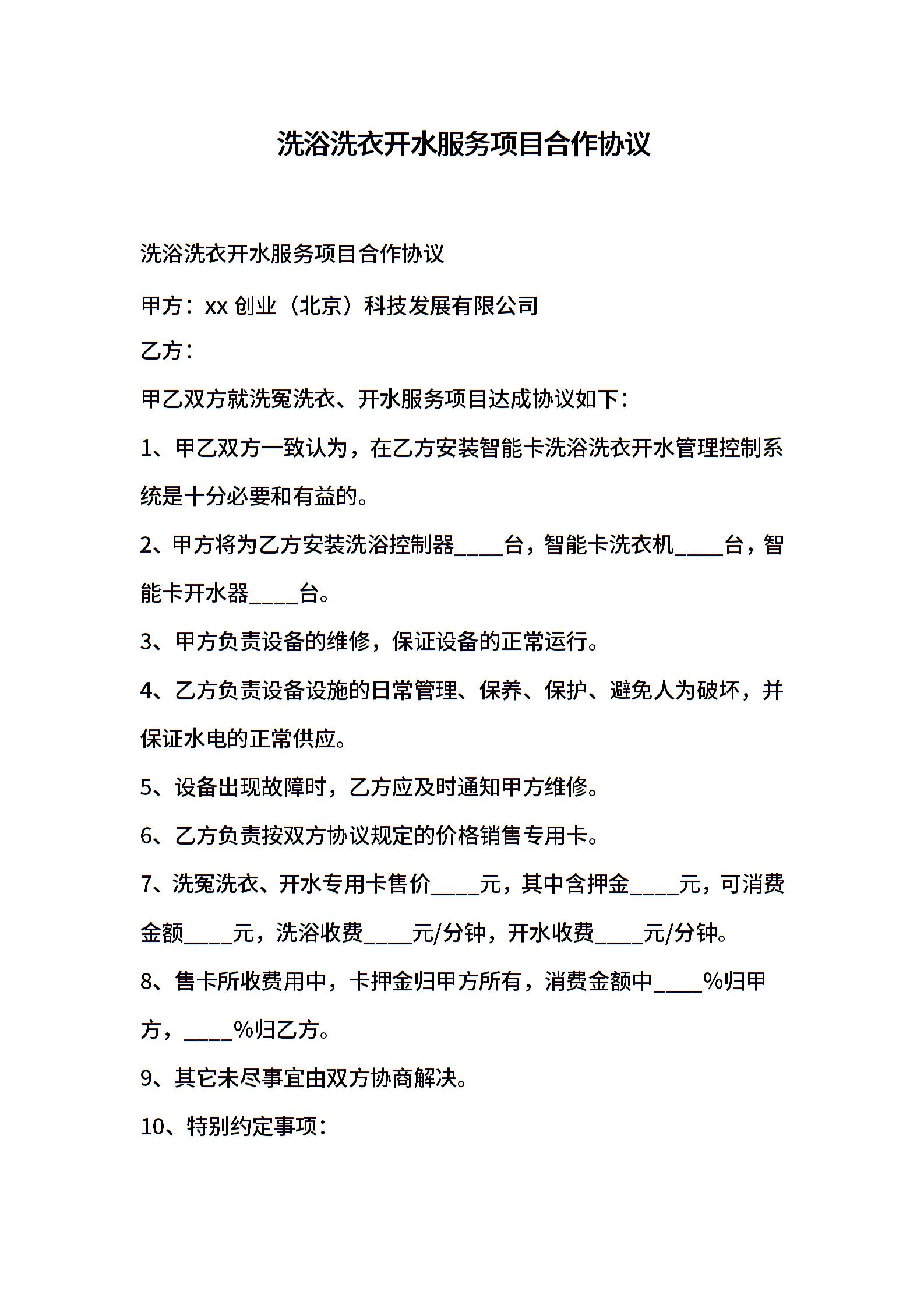 洗浴洗衣开水服务项目合作协议
