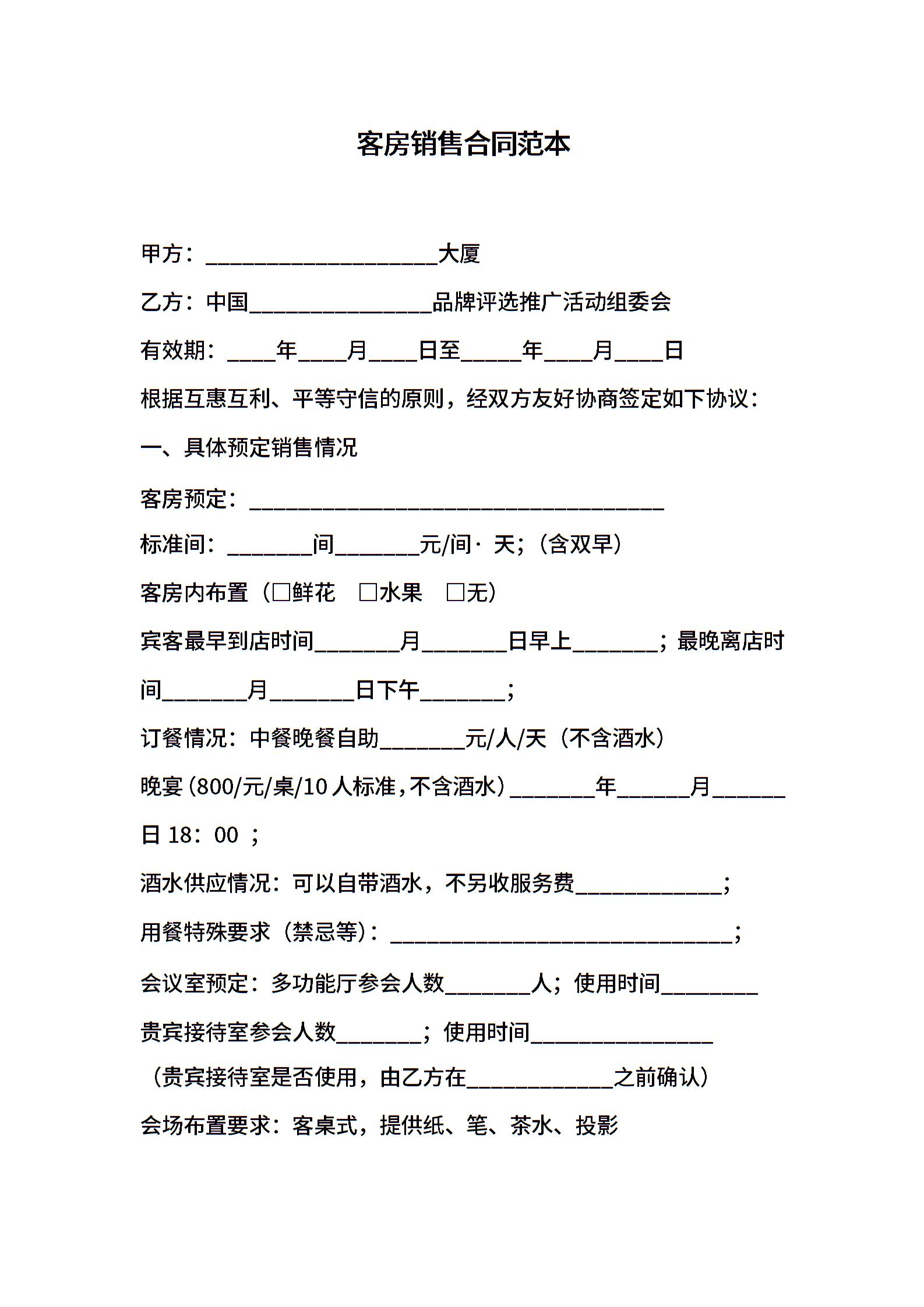 客房销售合同范本