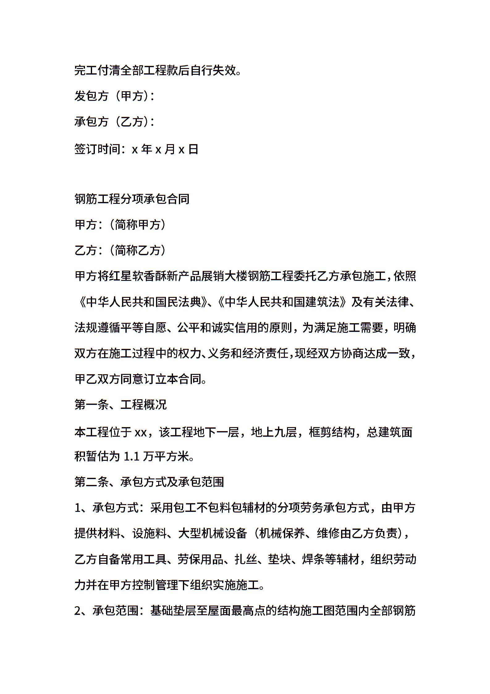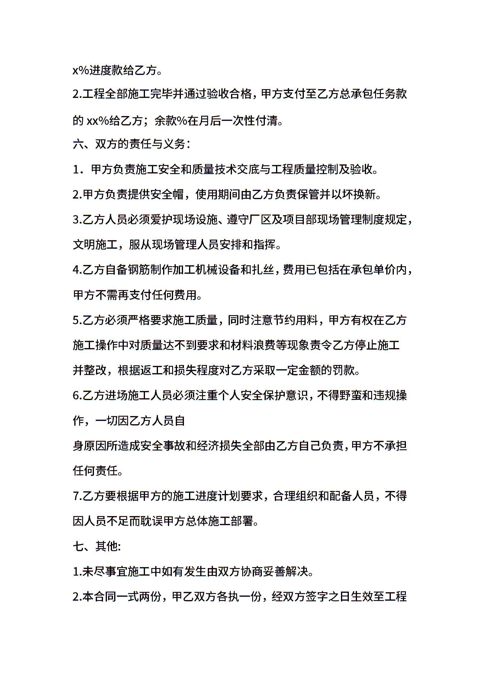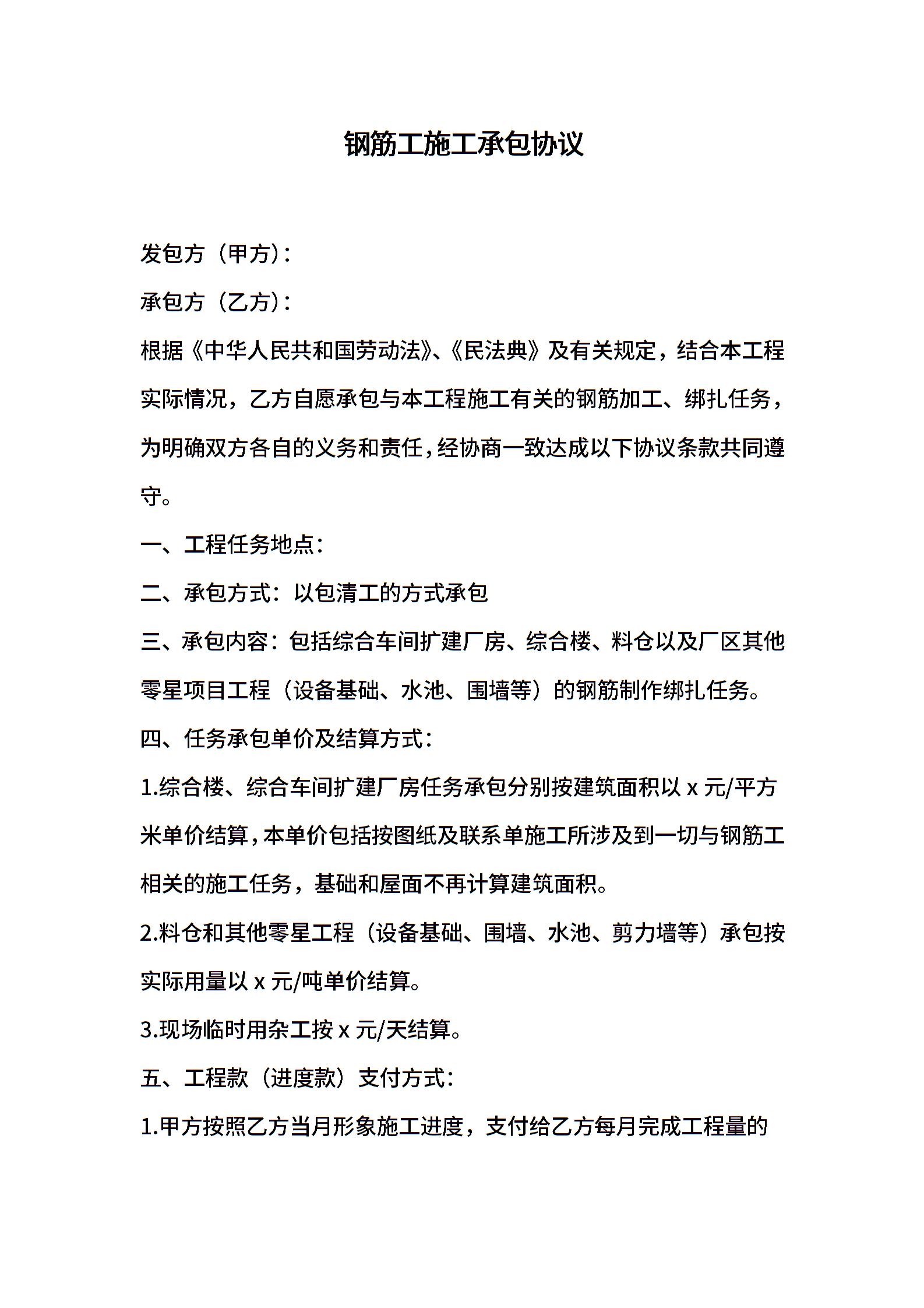 钢筋工施工承包协议