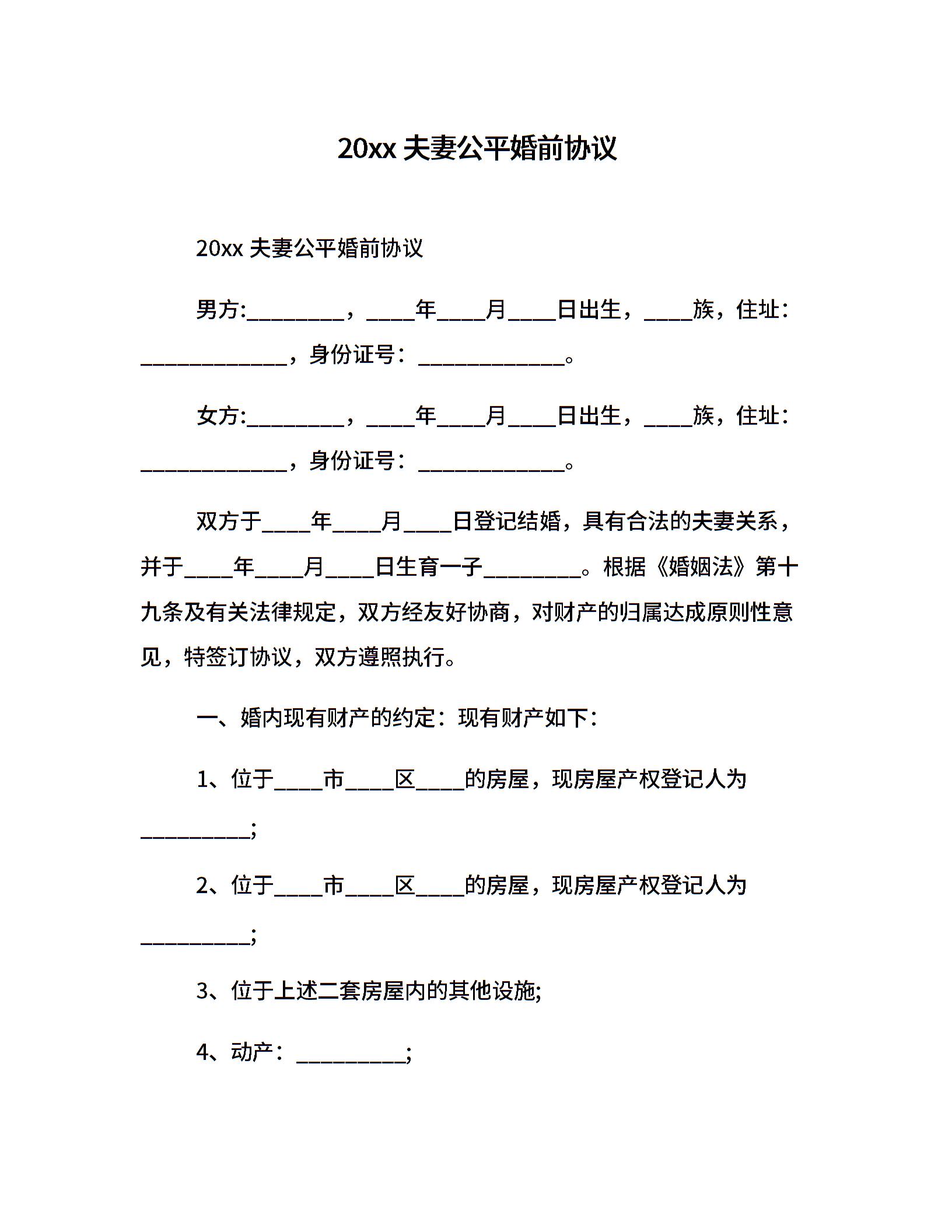 20xx夫妻公平婚前协议