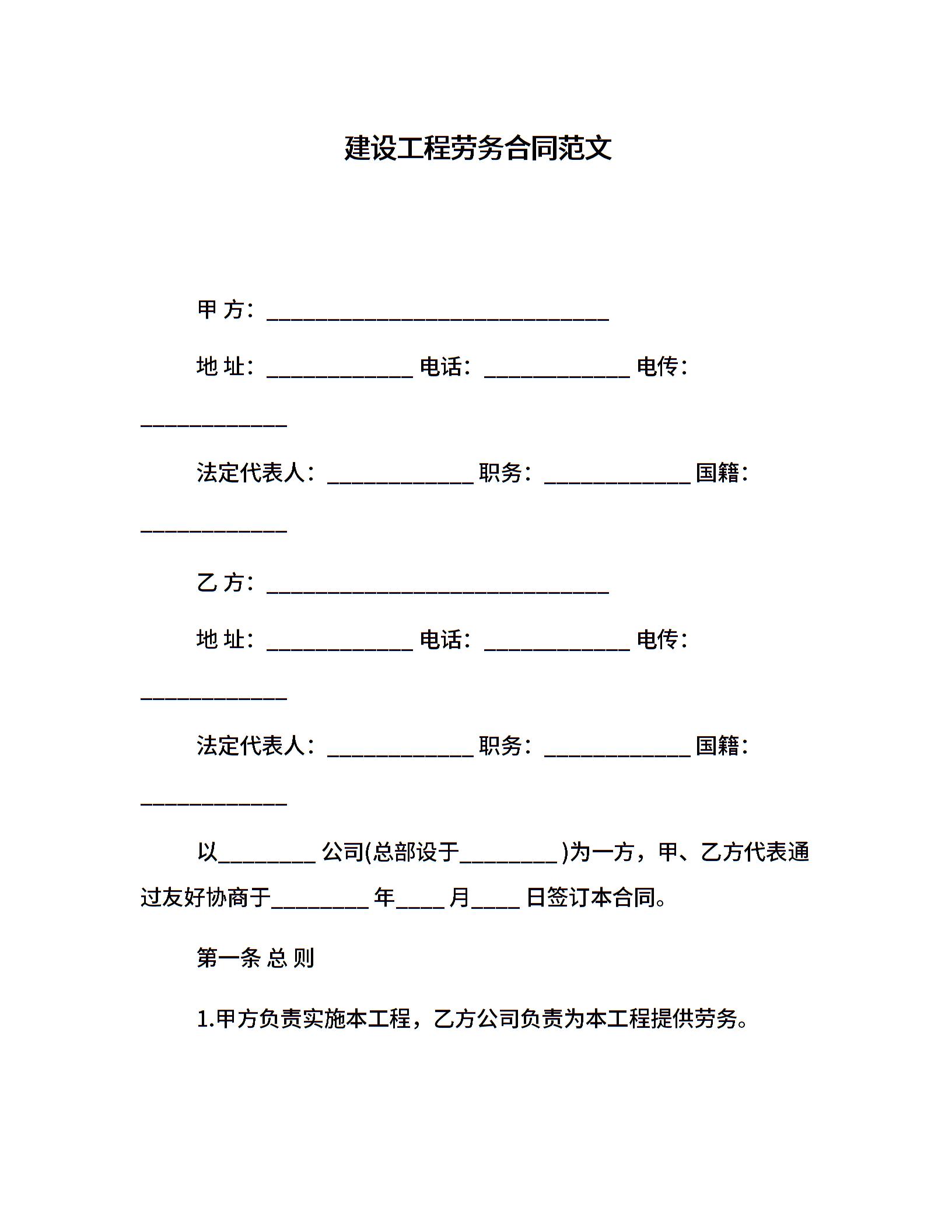 建设工程劳务合同范文