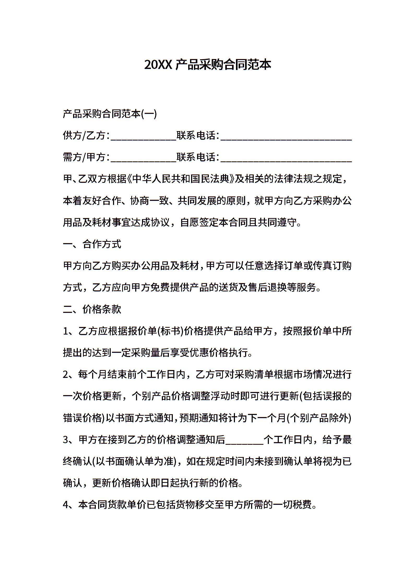 20XX产品采购合同范本
