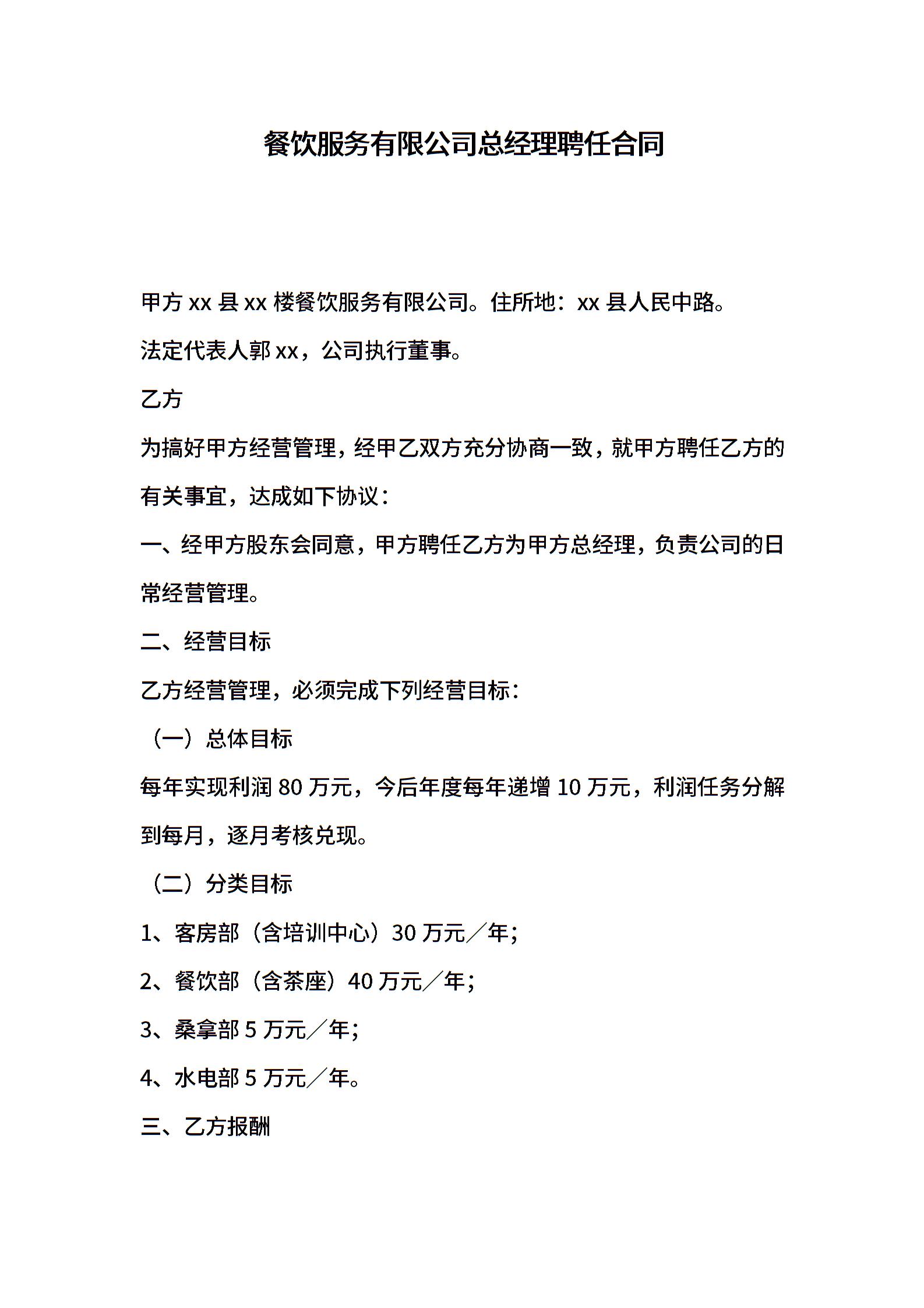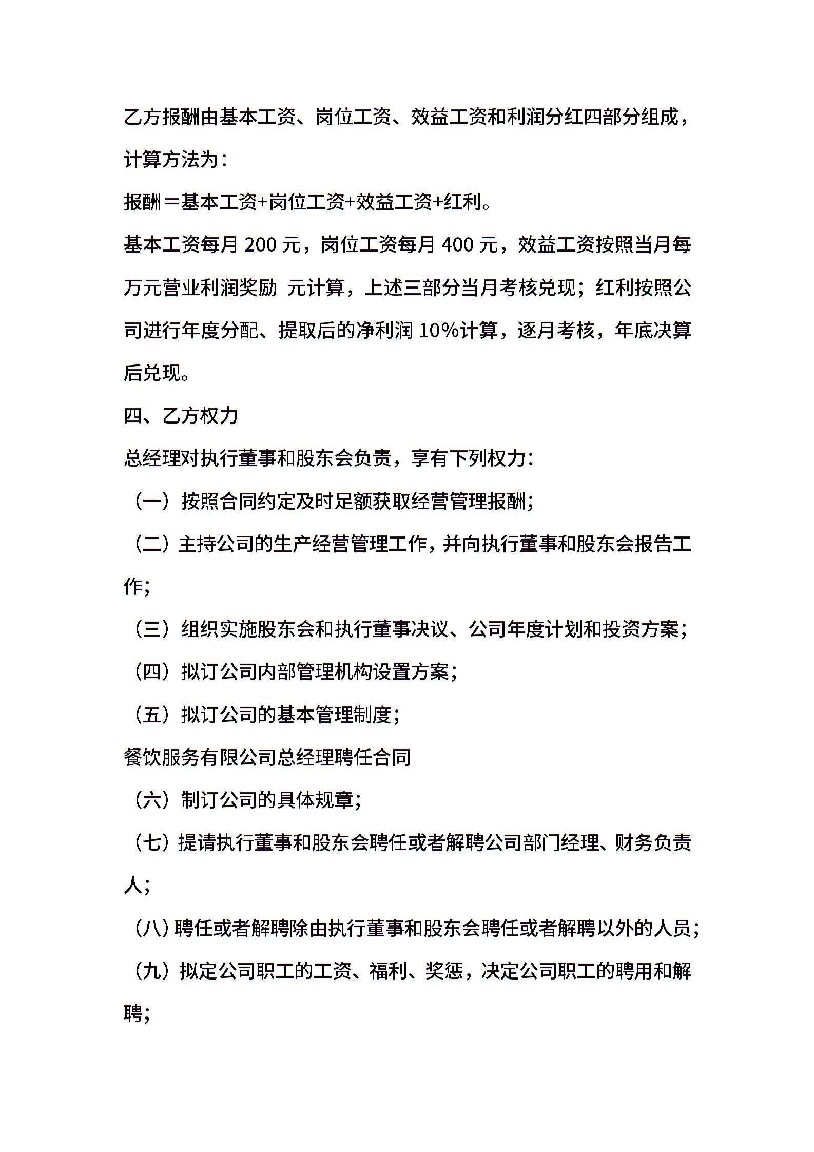 餐饮服务有限公司总经理聘任合同