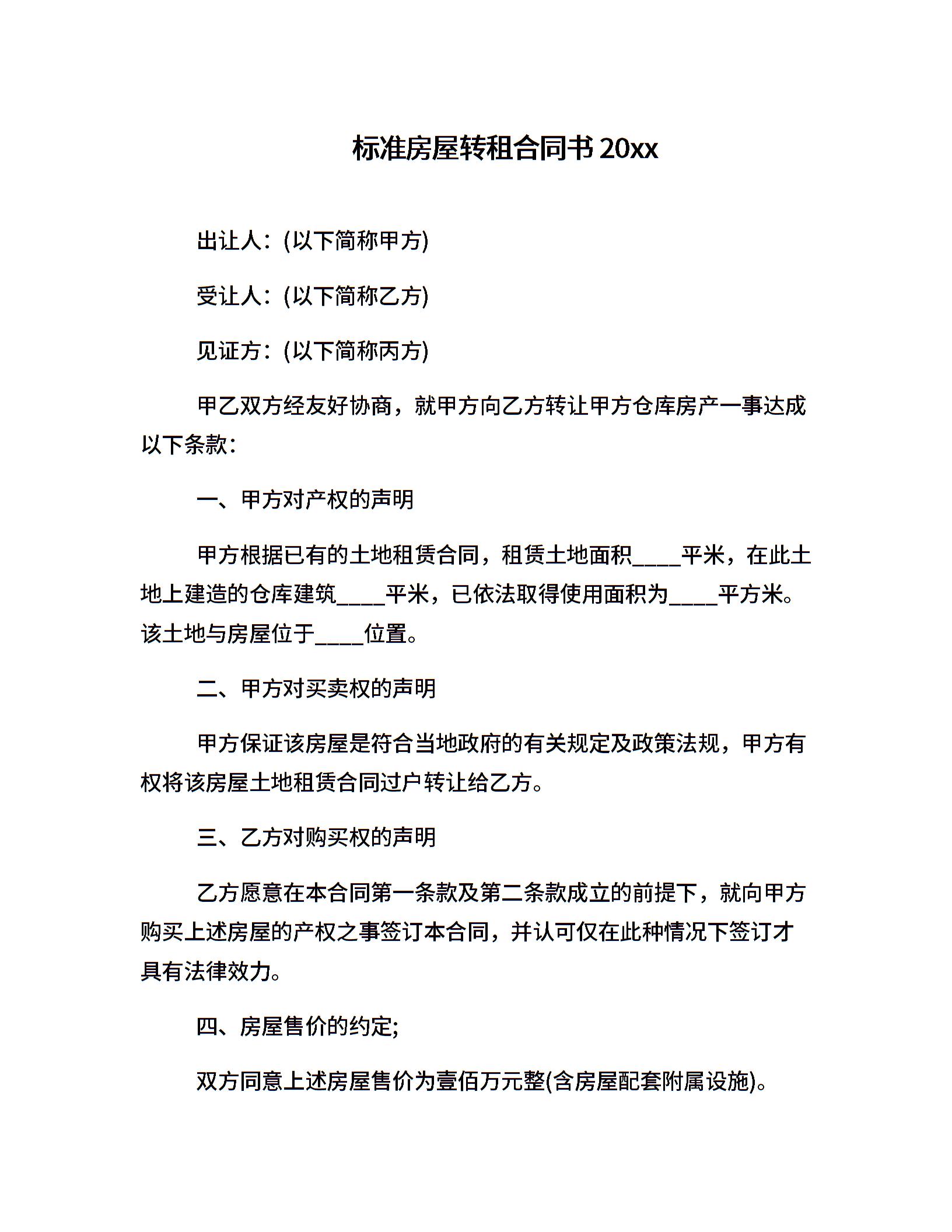 标准房屋转租合同书20xx