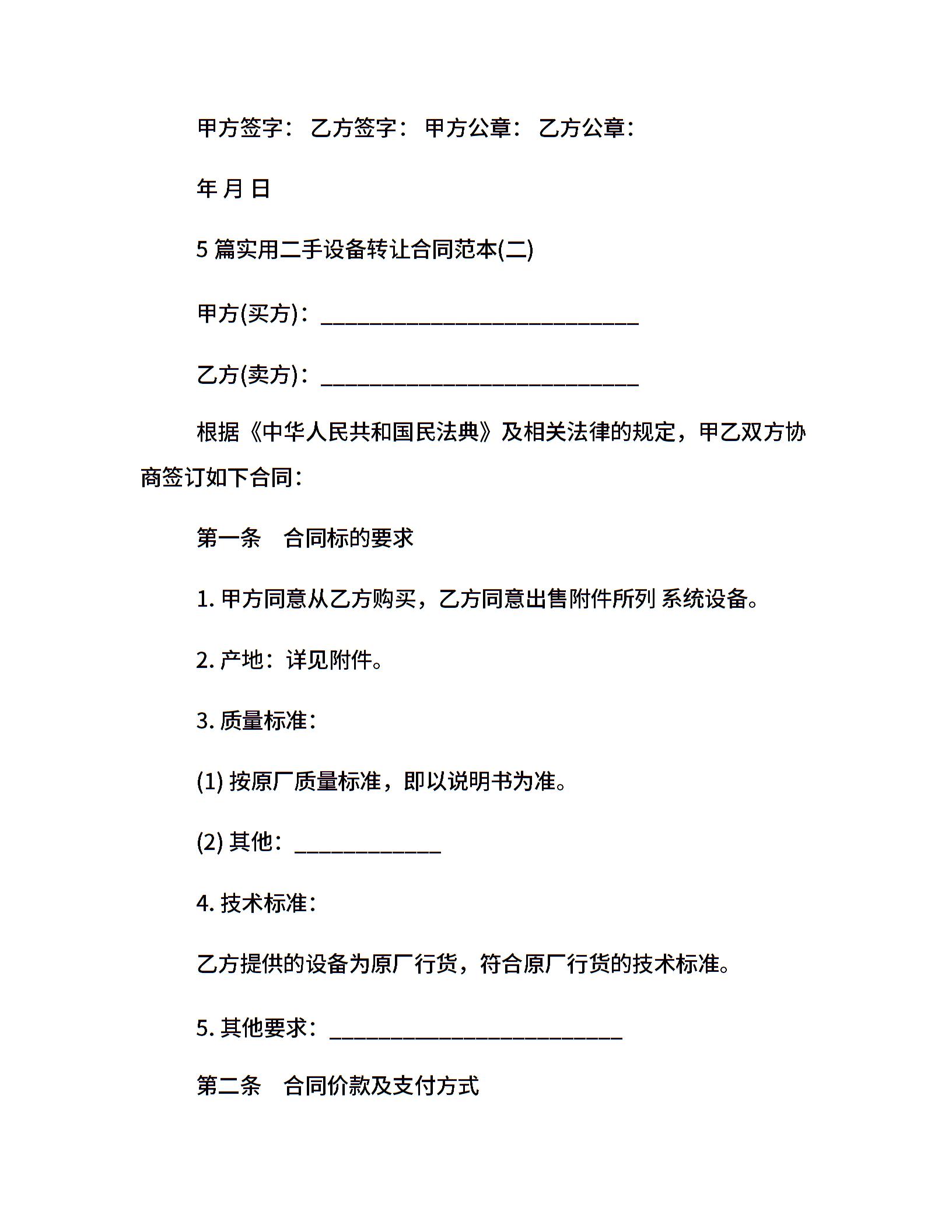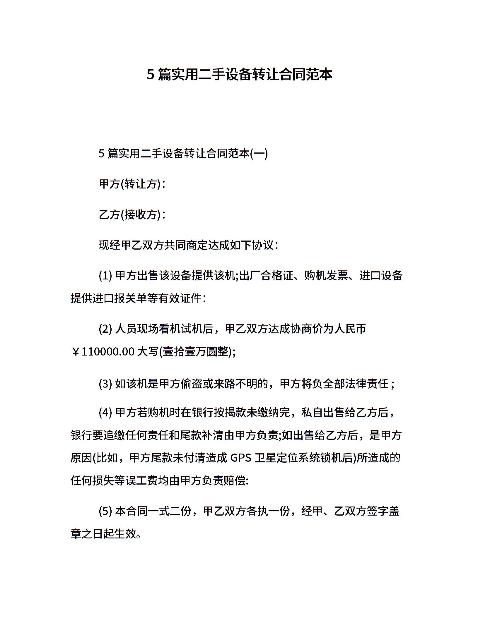 5篇实用二手设备转让合同范本