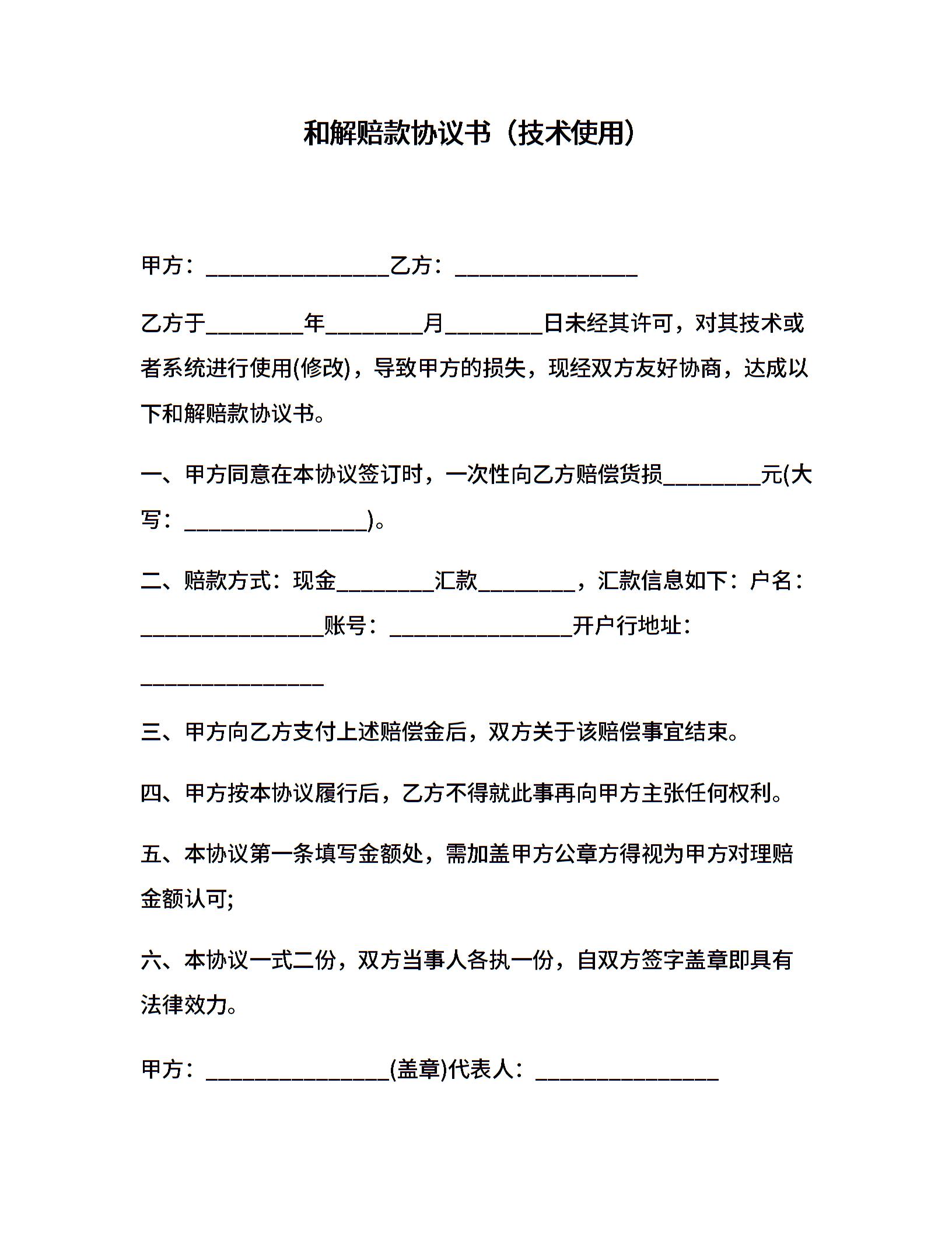 和解赔款协议书(技术使用)