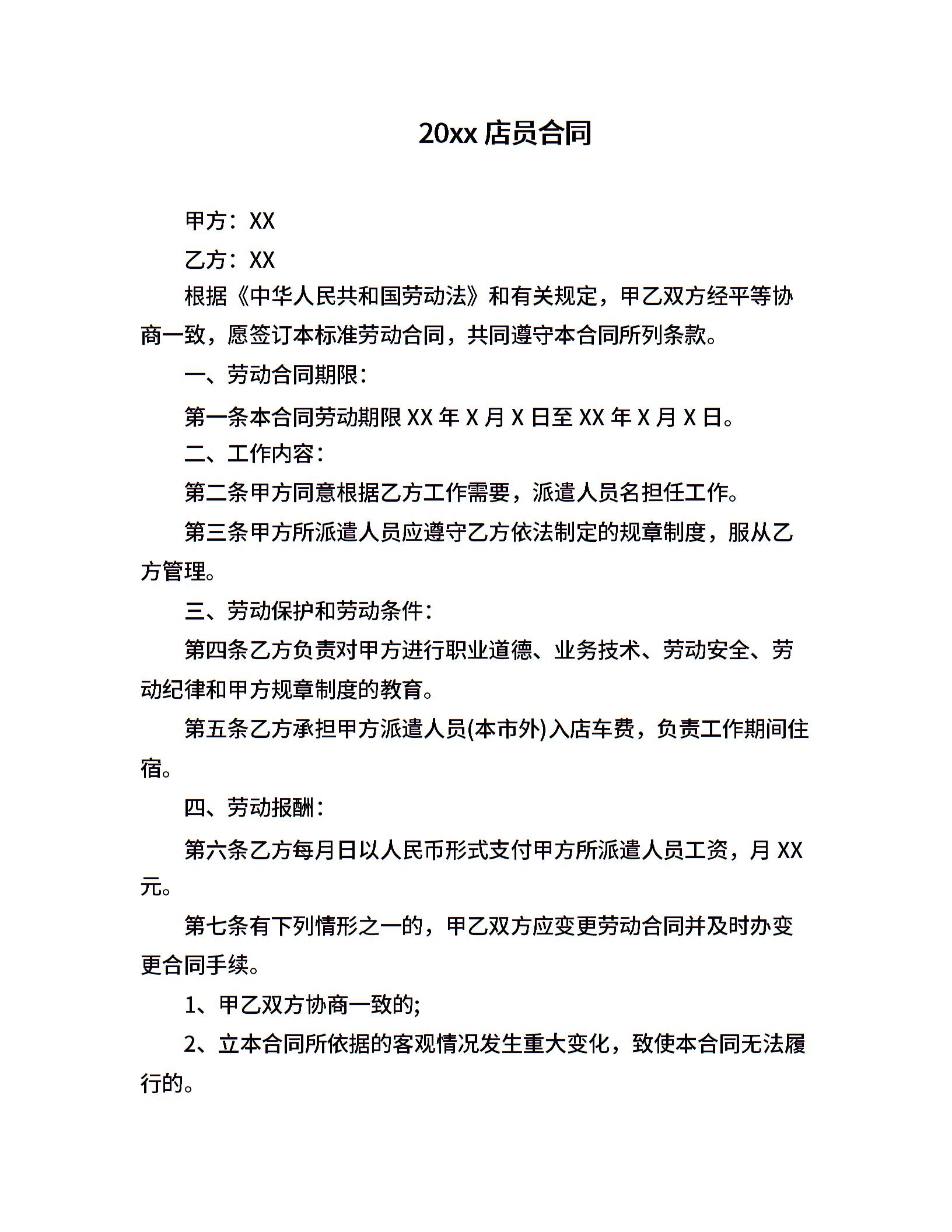 20xx店员合同
