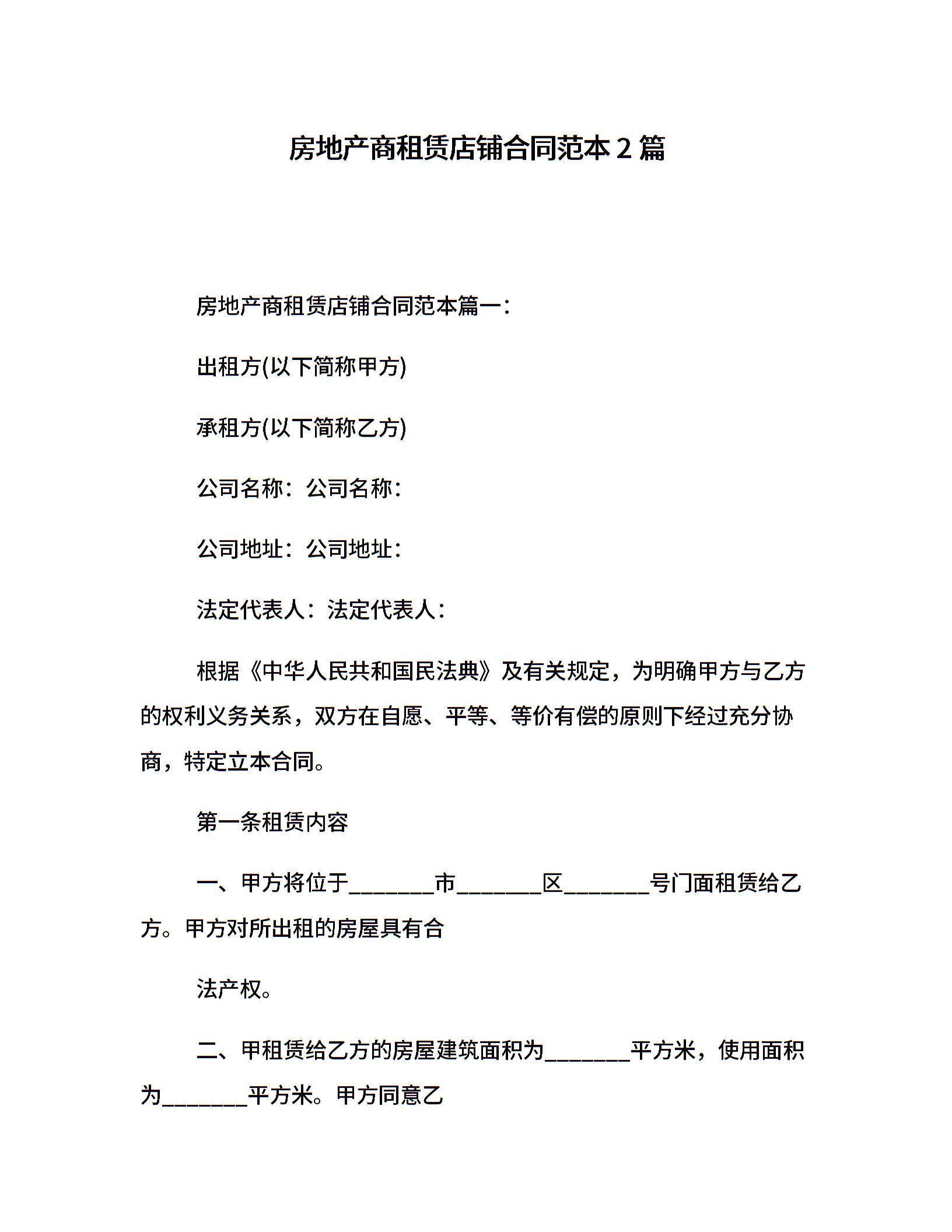 房地产商租赁店铺合同范本2篇