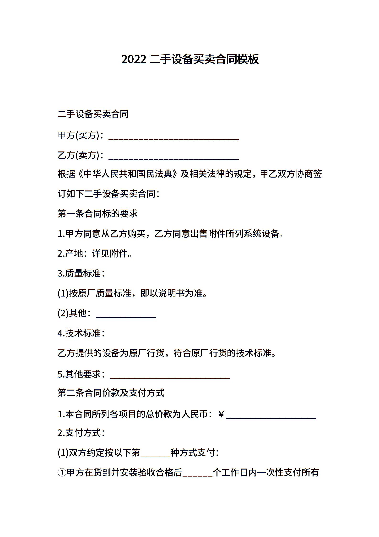 2022二手设备买卖合同模板