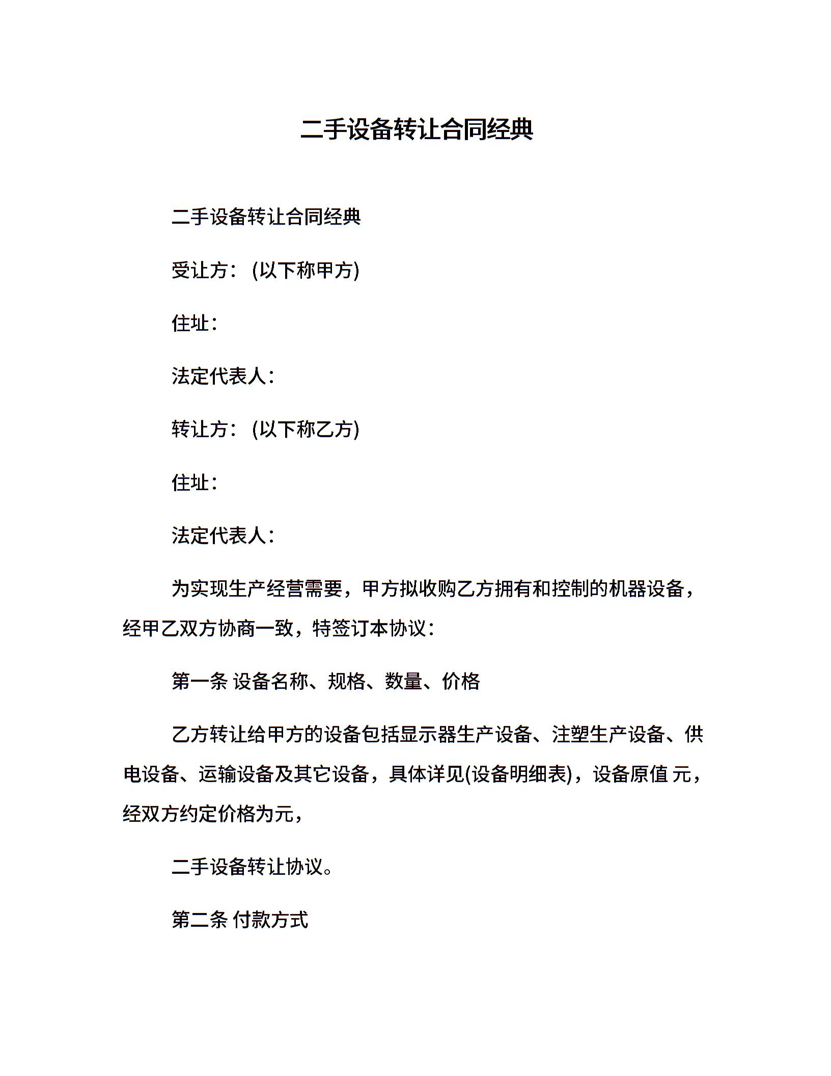 二手设备转让合同经典