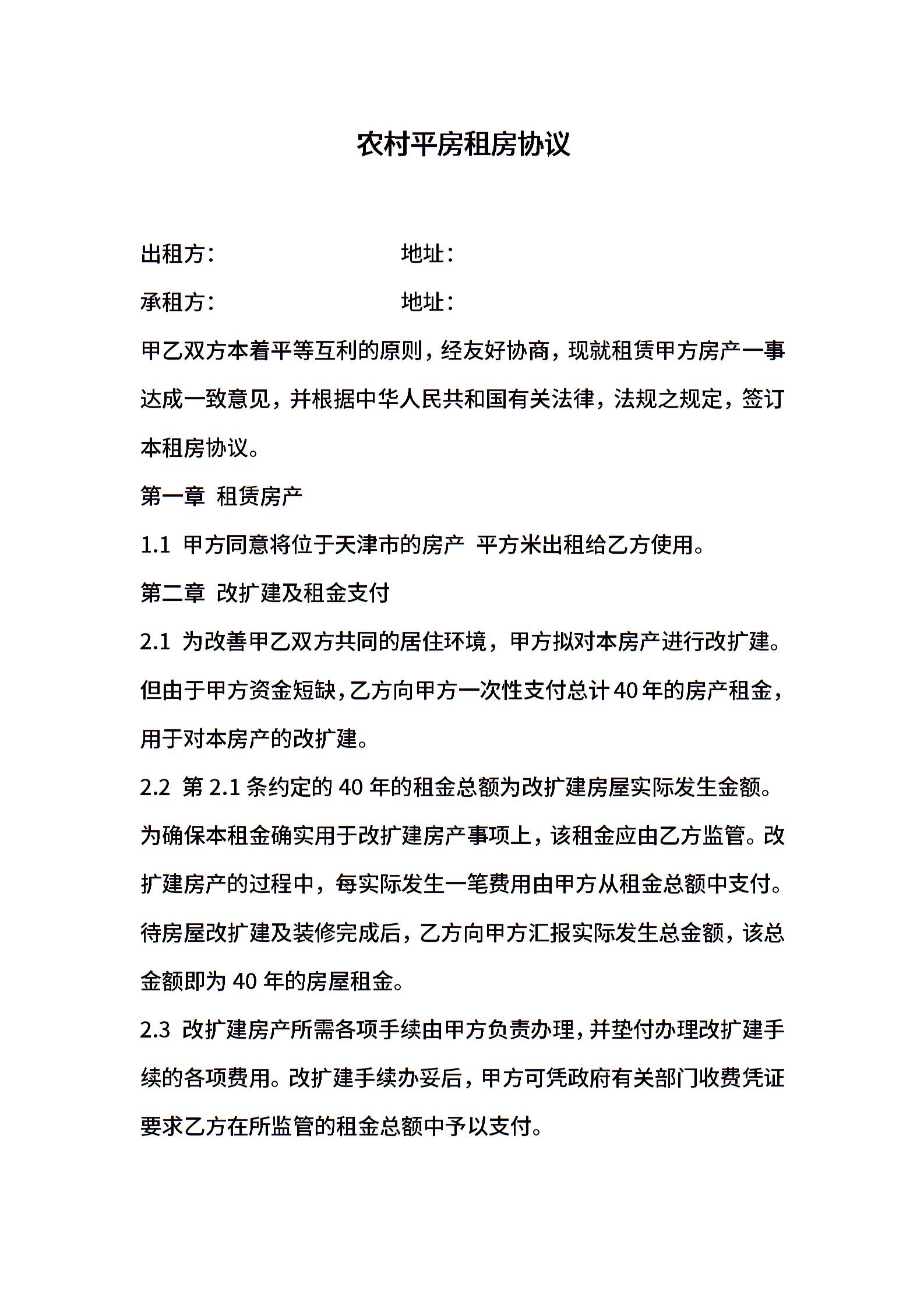 农村平房租房协议