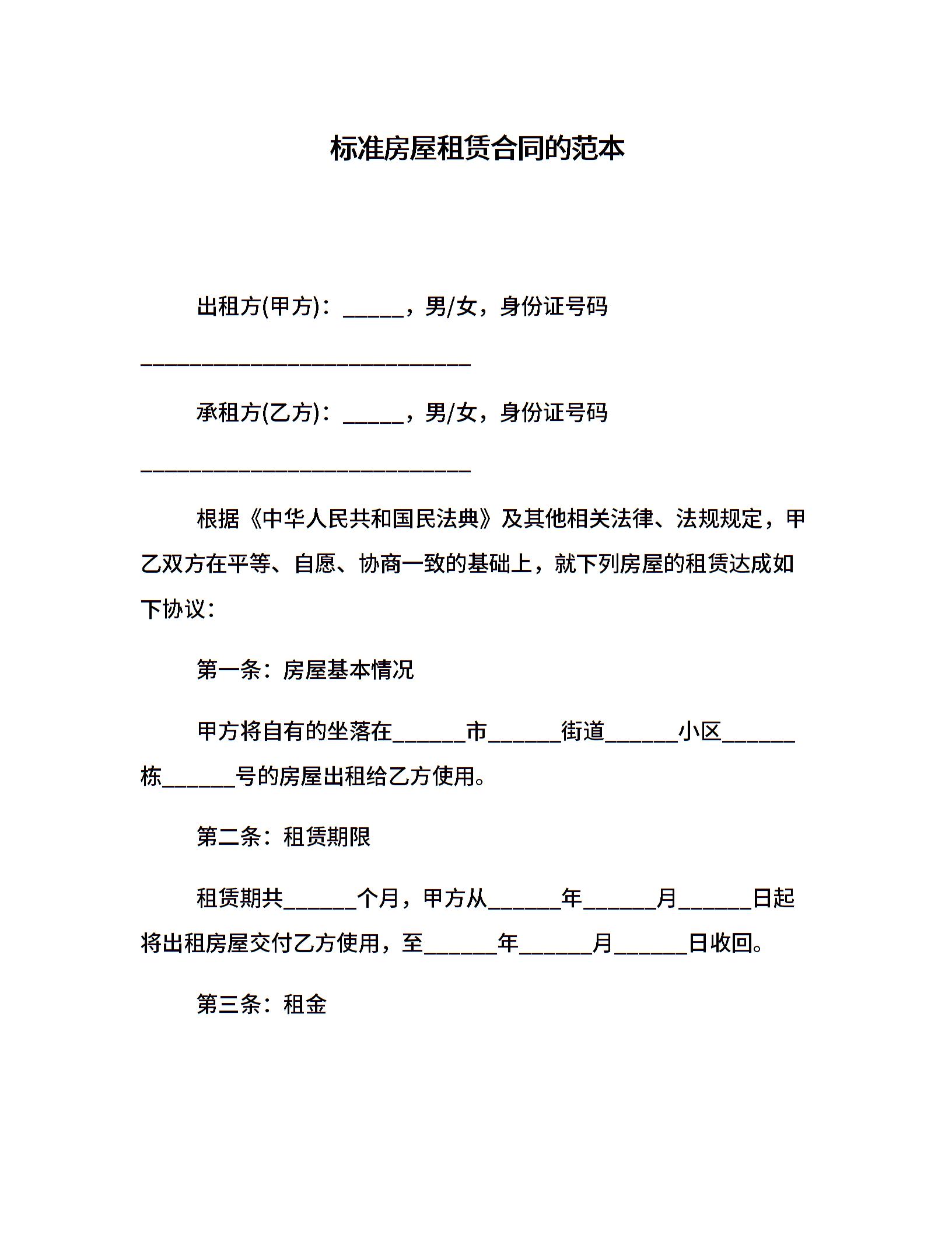 标准房屋租赁合同的范本