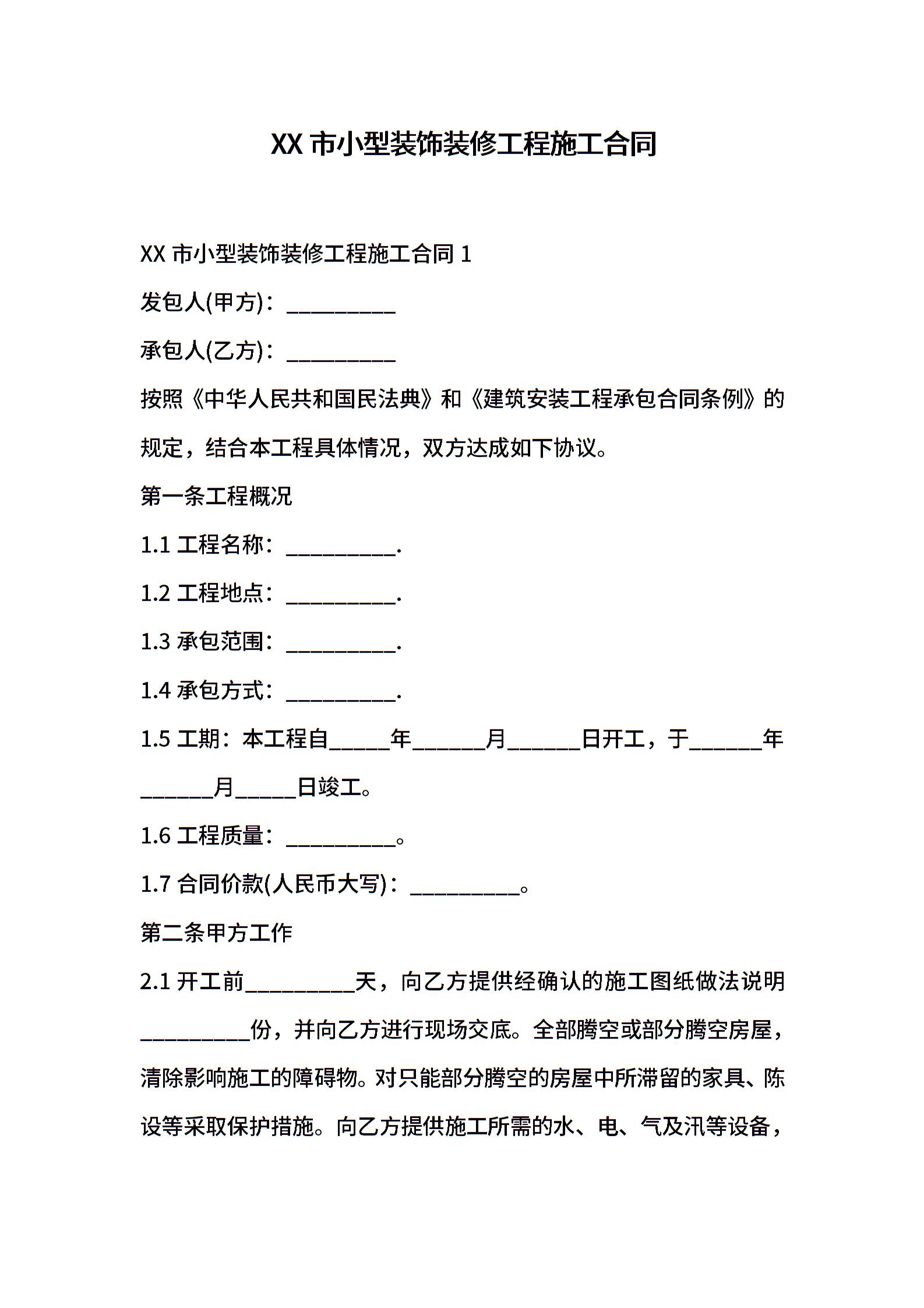 XX市小型装饰装修工程施工合同