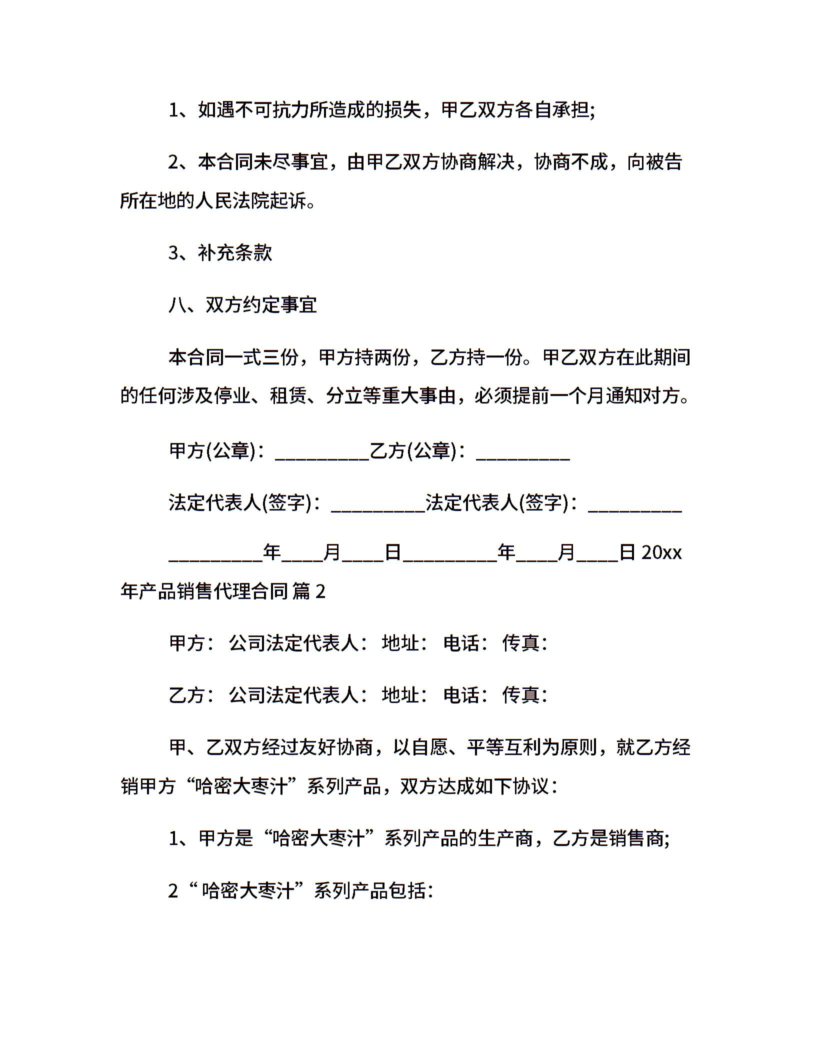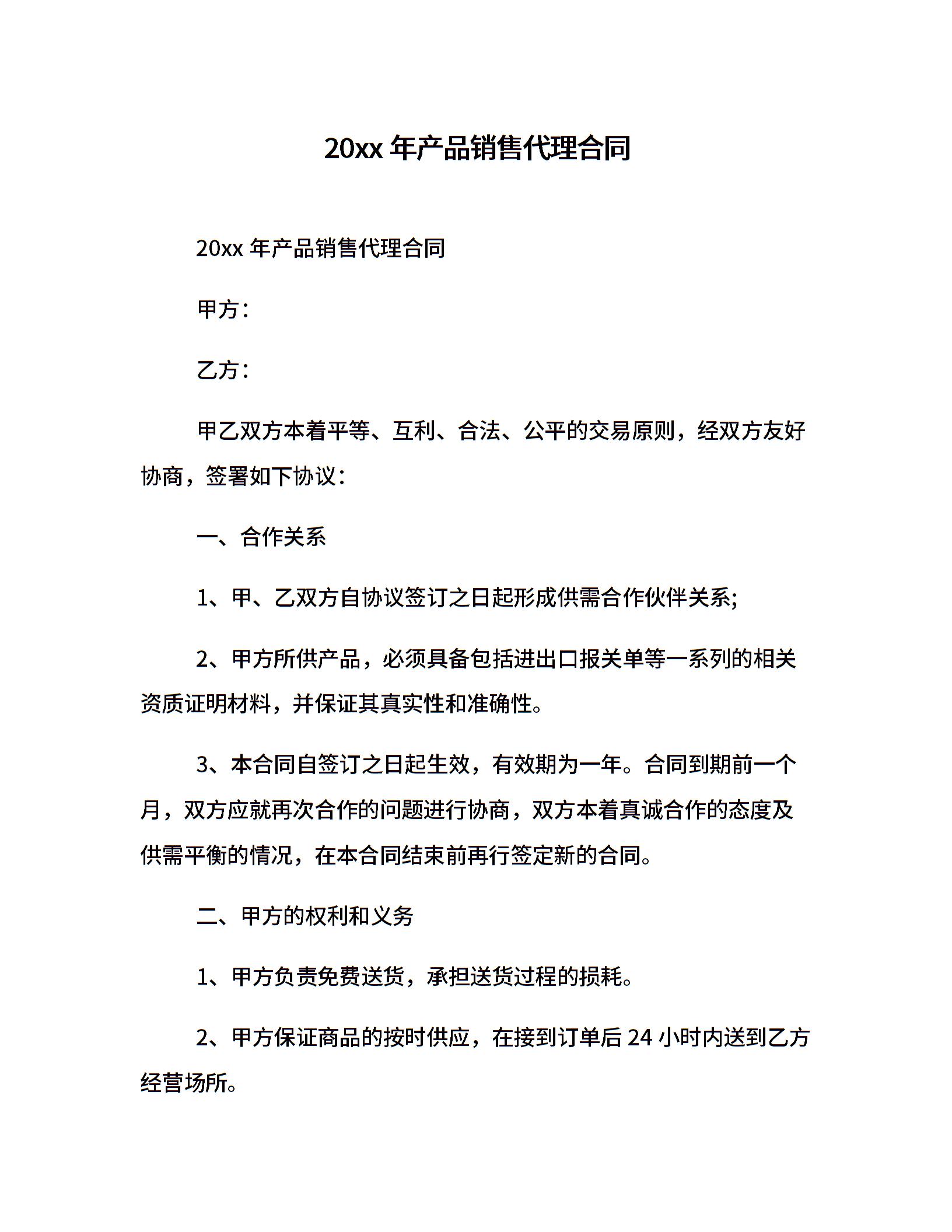 20xx年产品销售代理合同