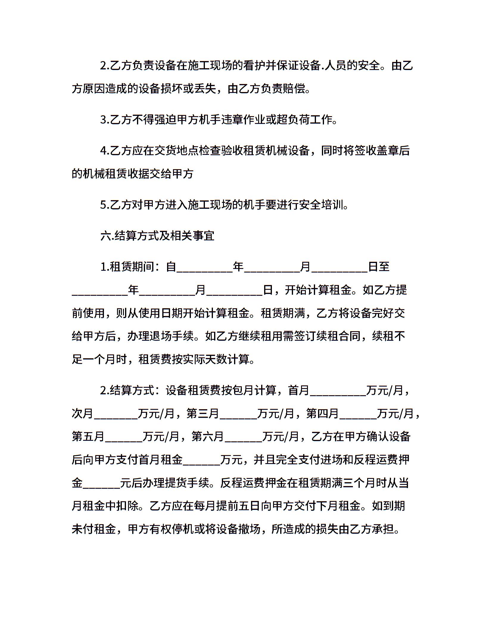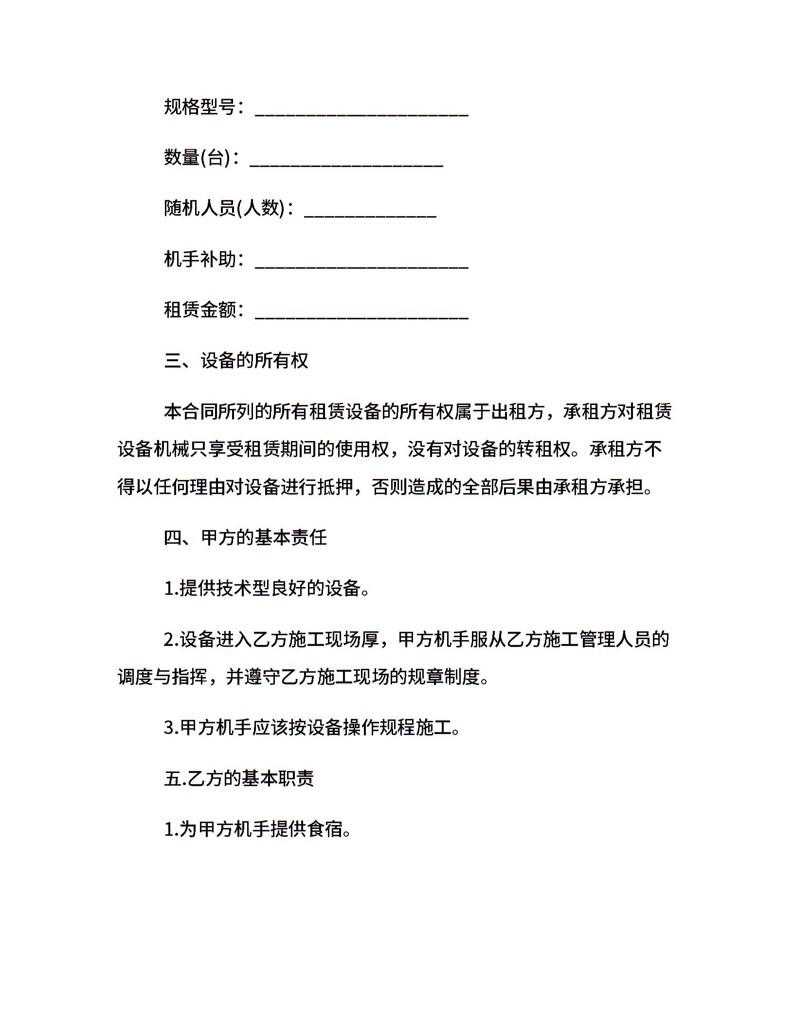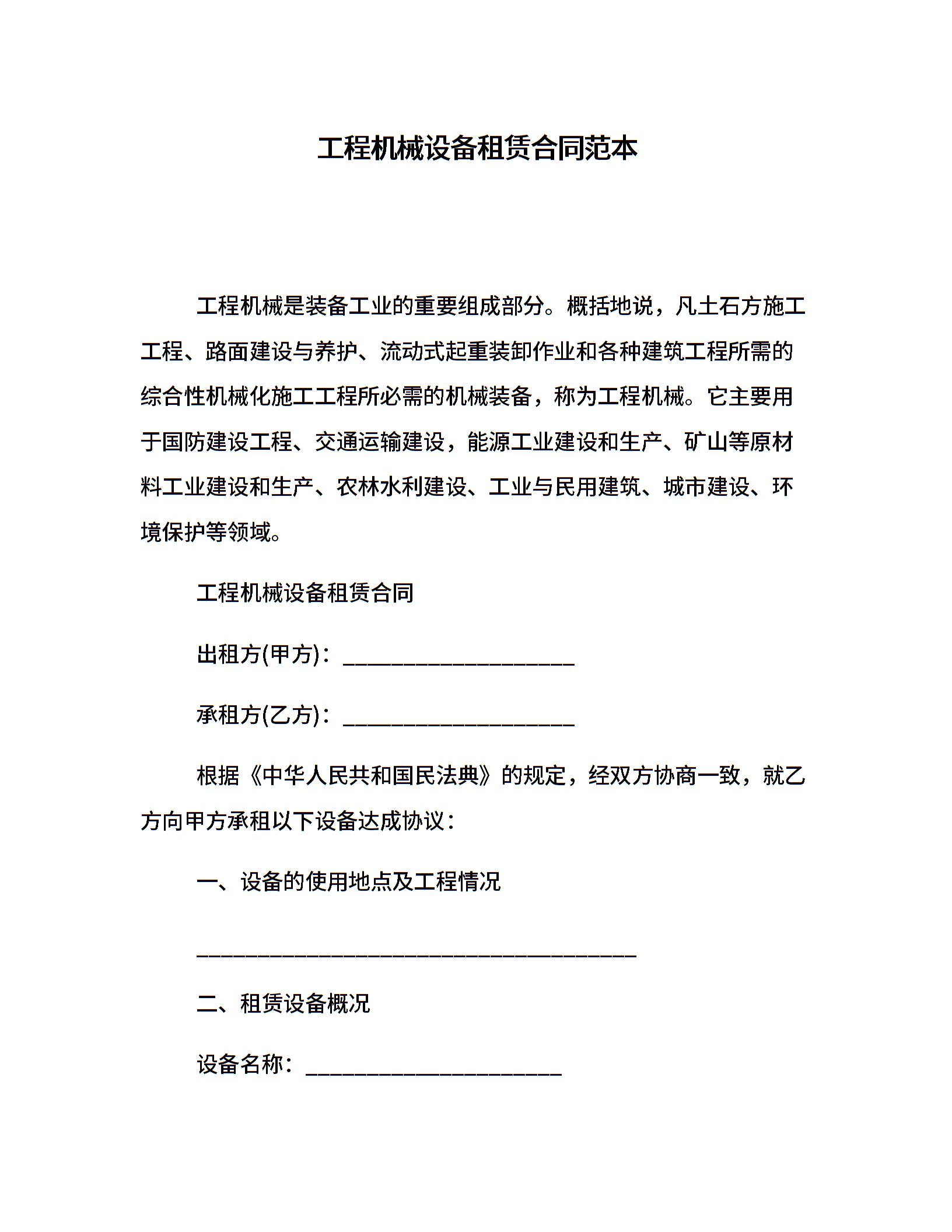 工程机械设备租赁合同范本