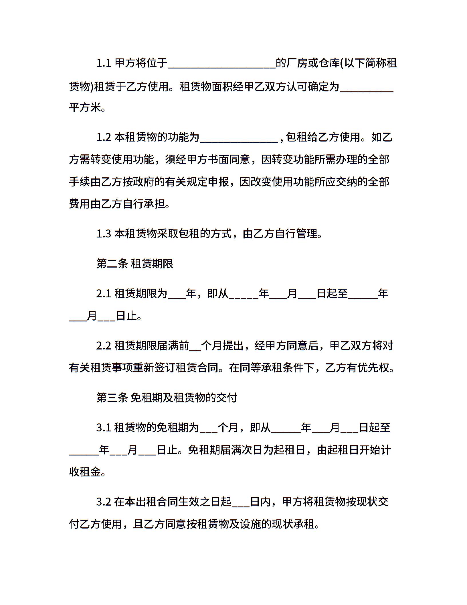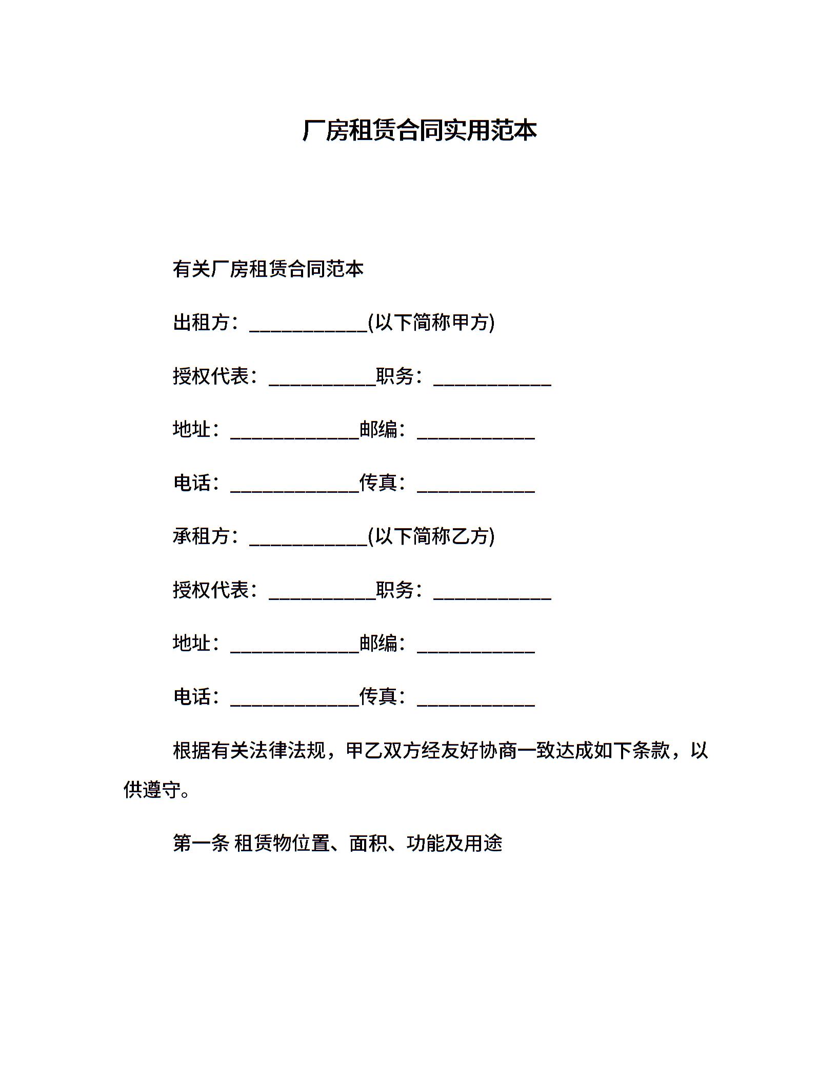 厂房租赁合同实用范本