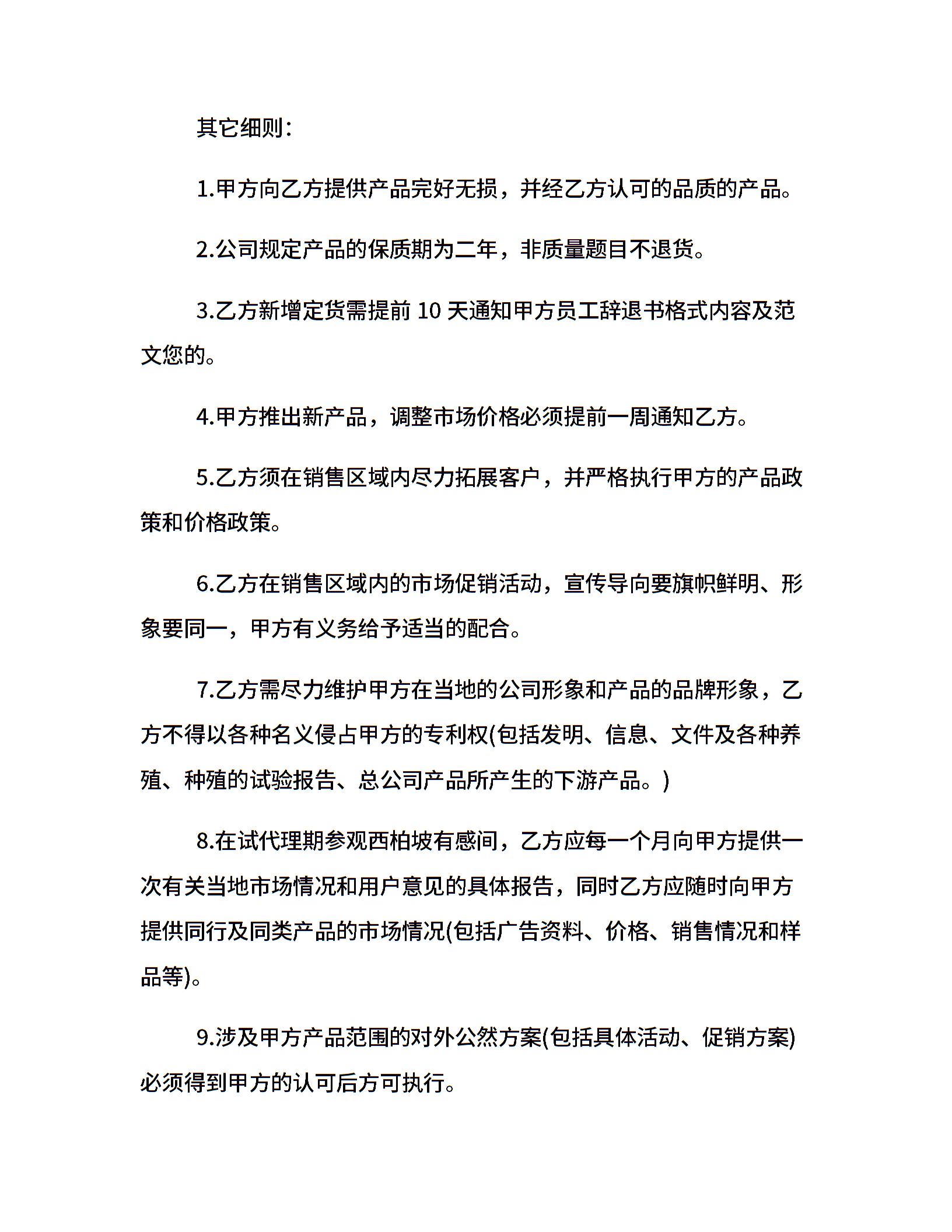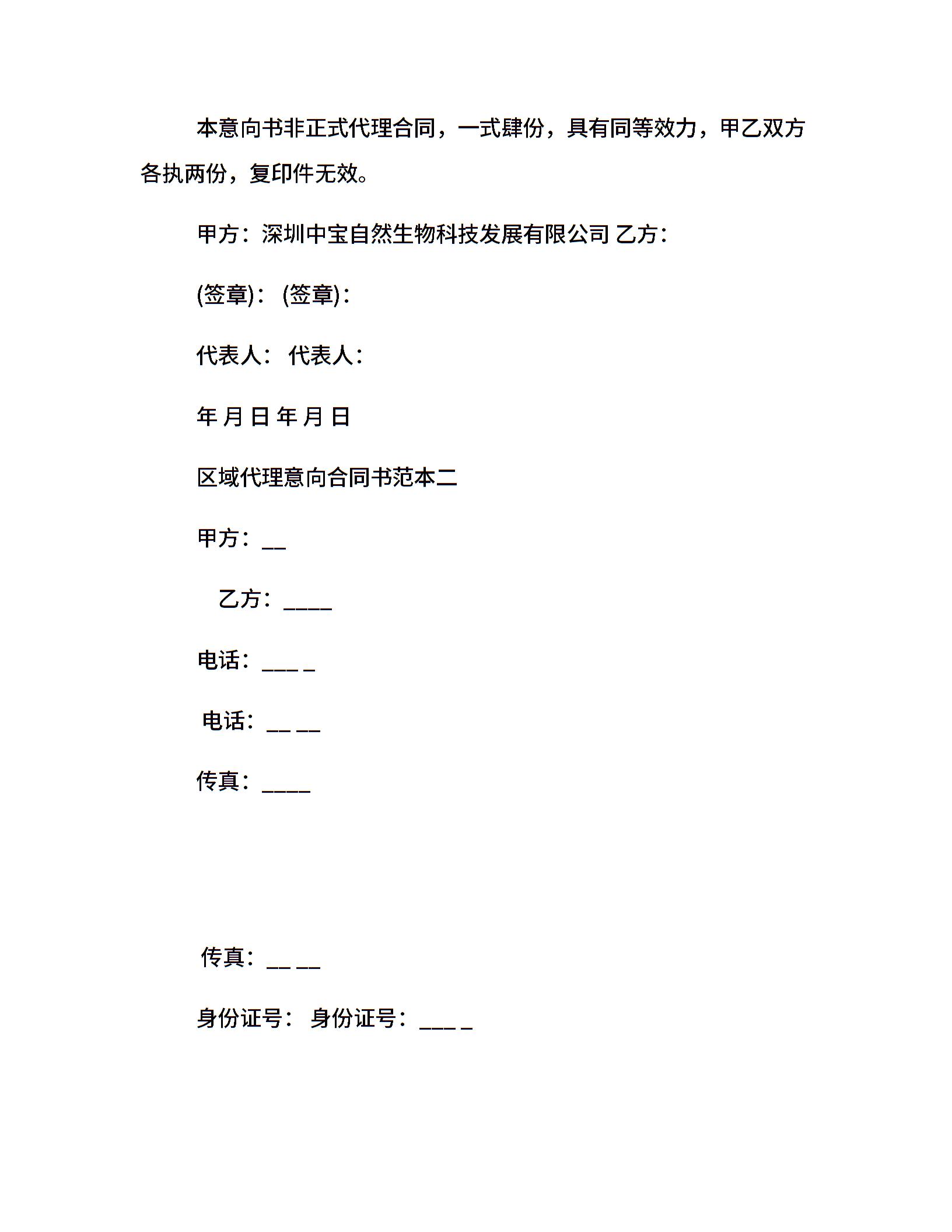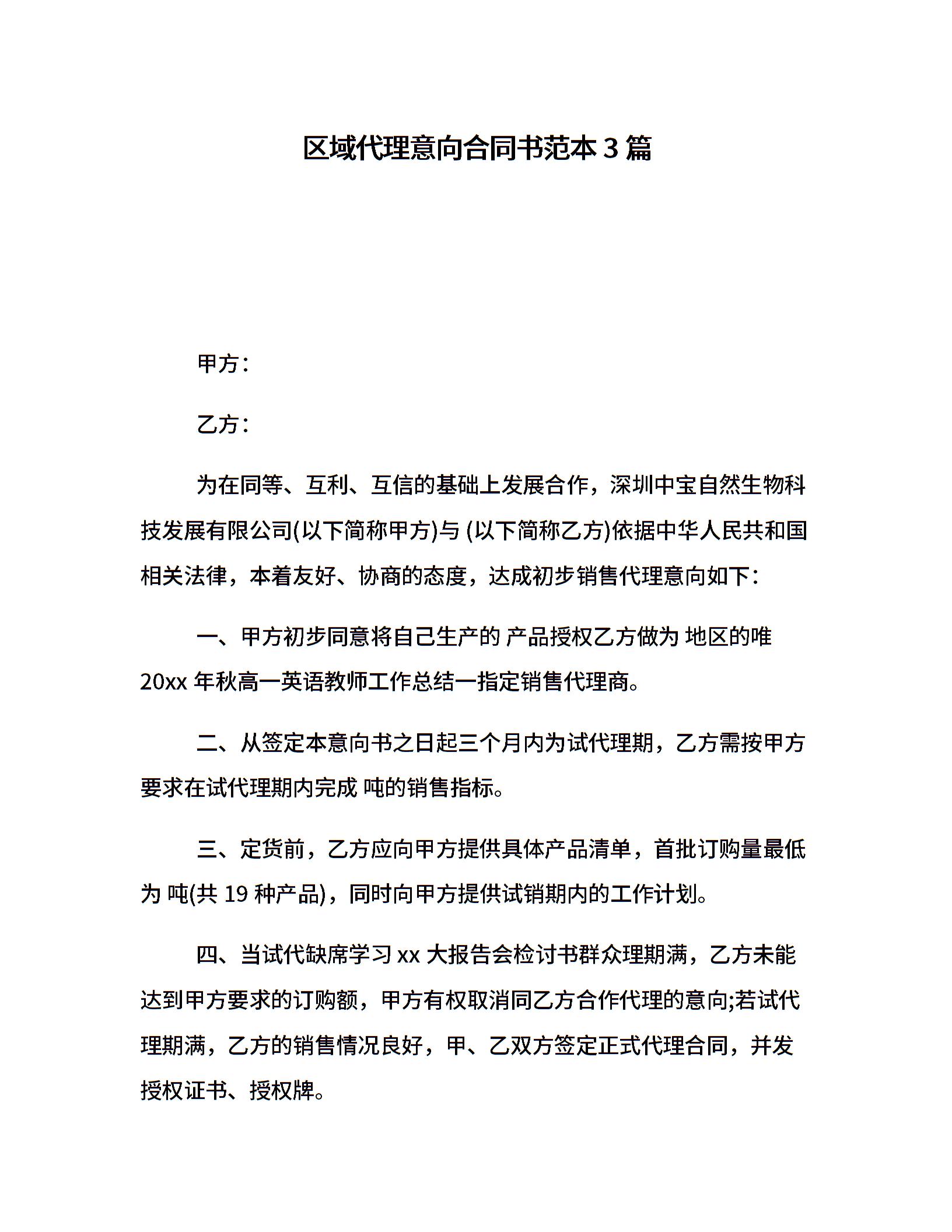 区域代理意向合同书范本3篇