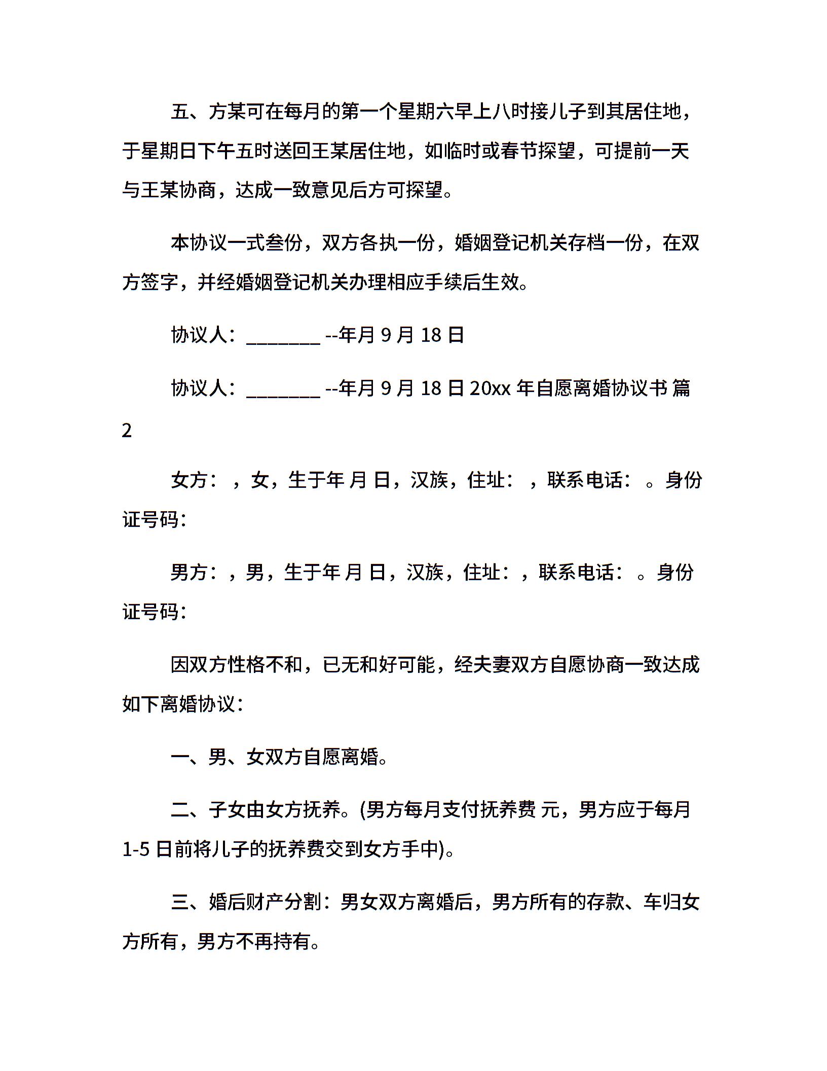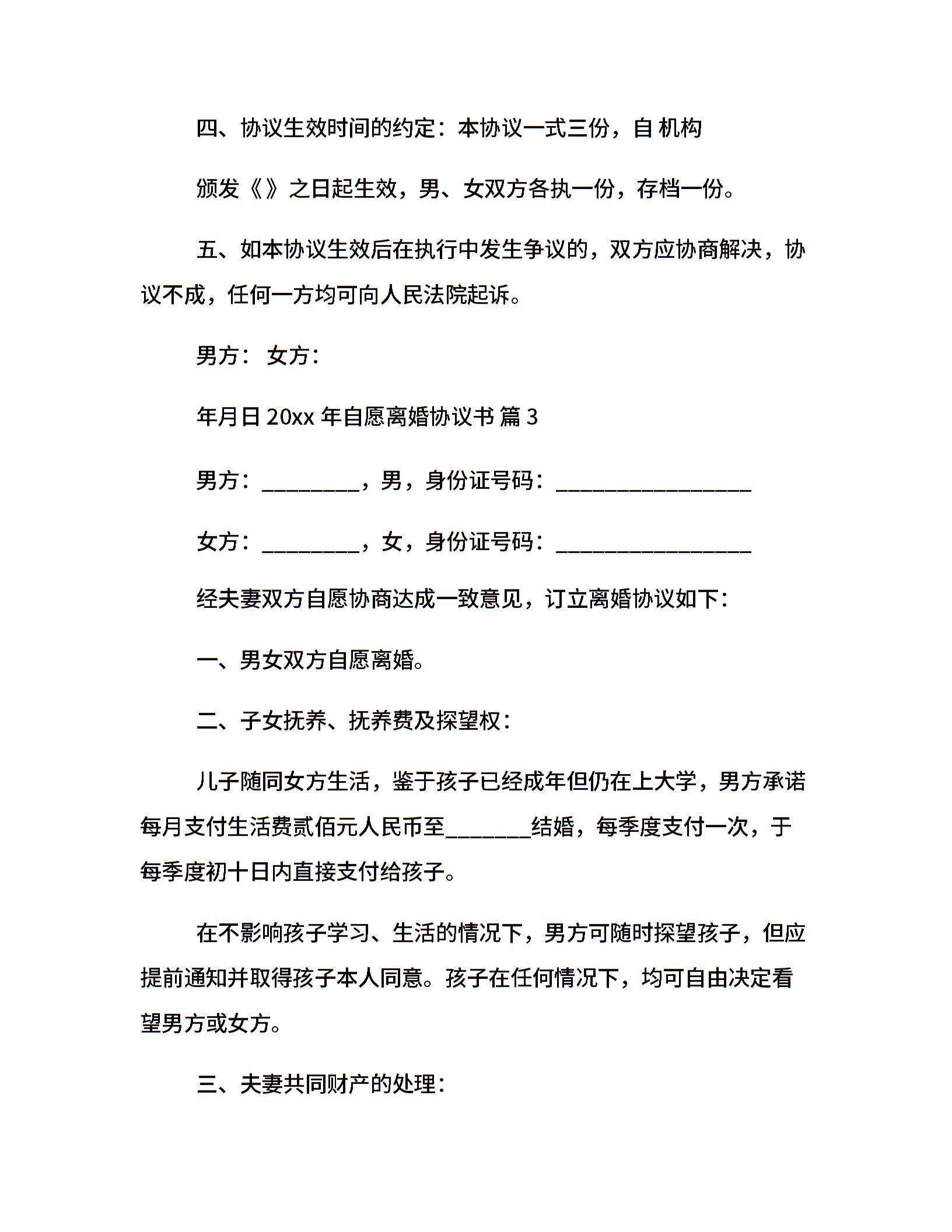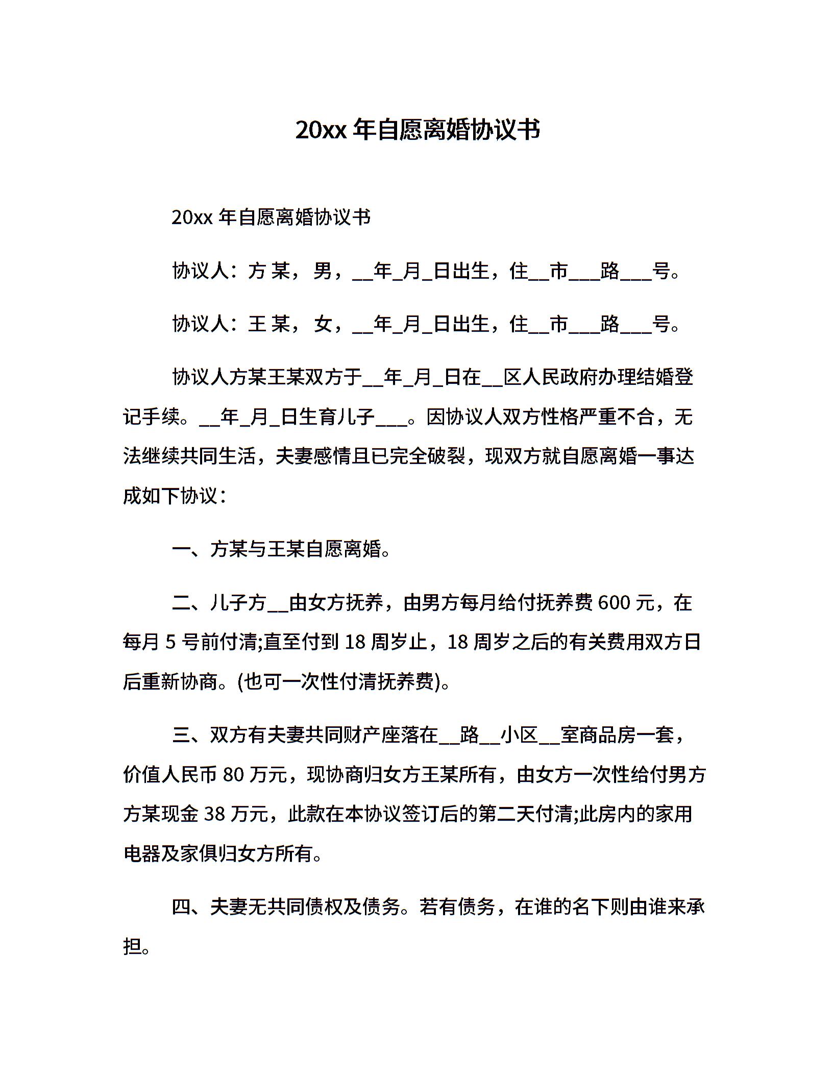 20xx年自愿离婚协议书