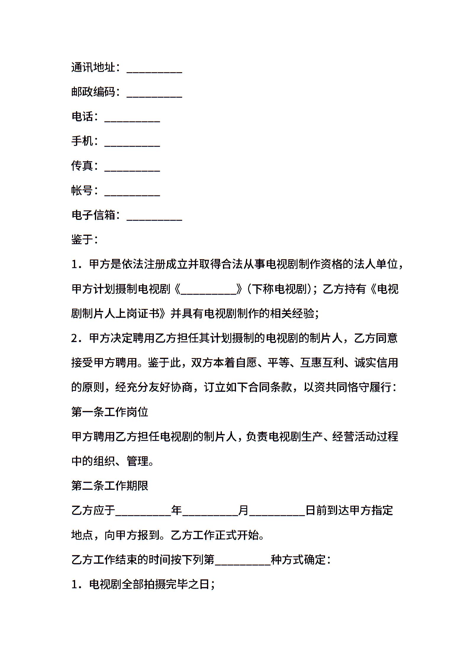 影视剧制片人聘用合同(电视剧)