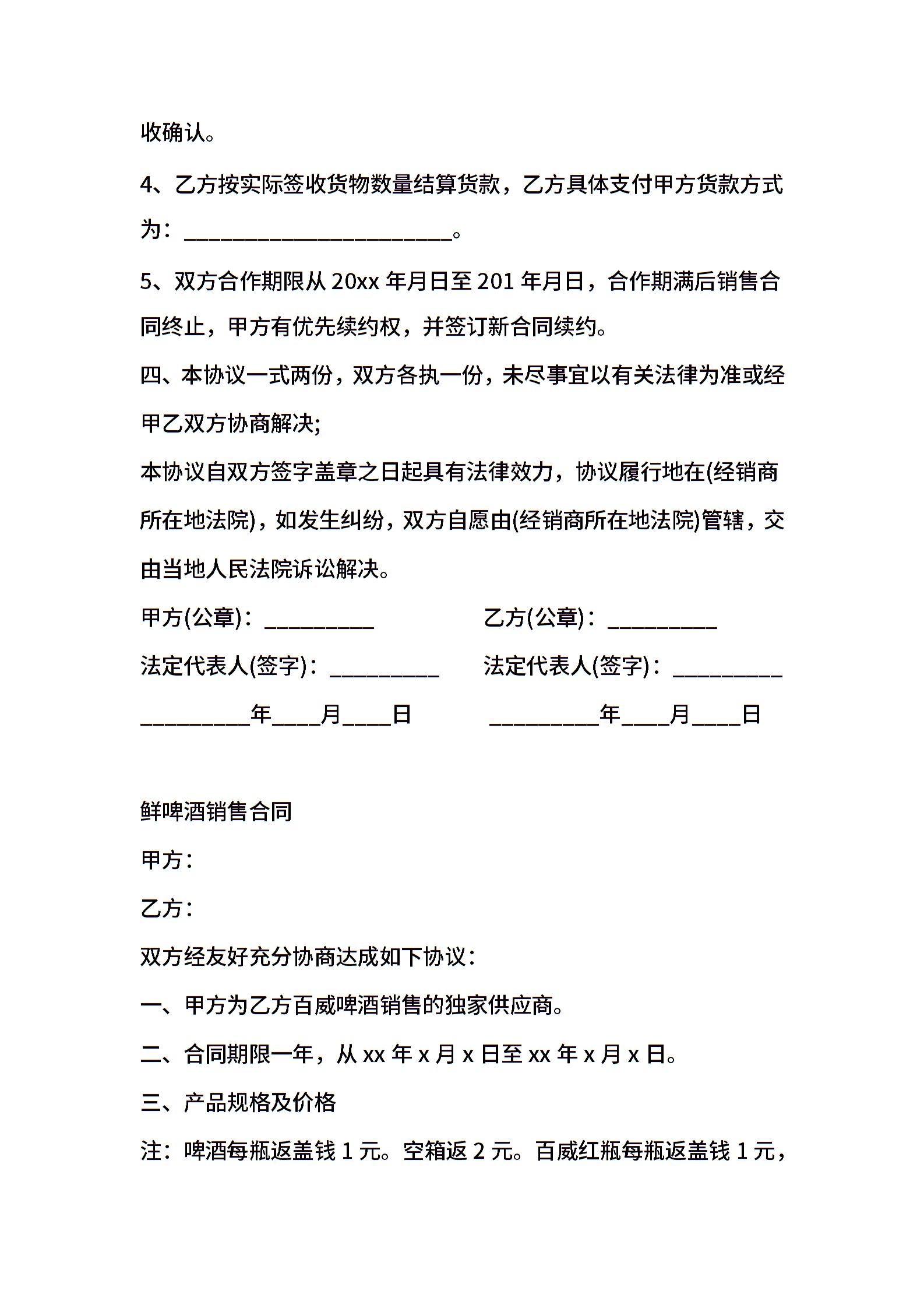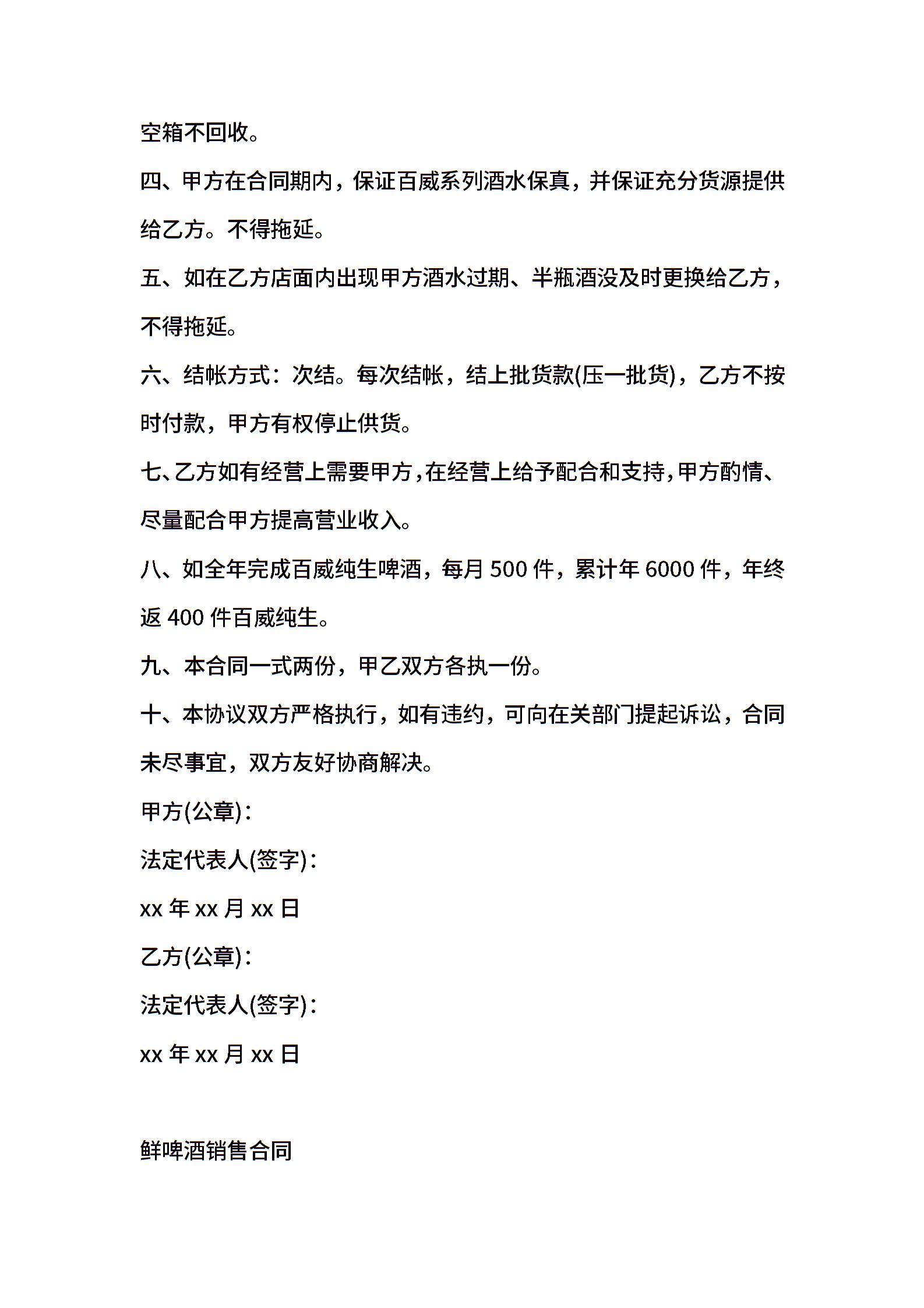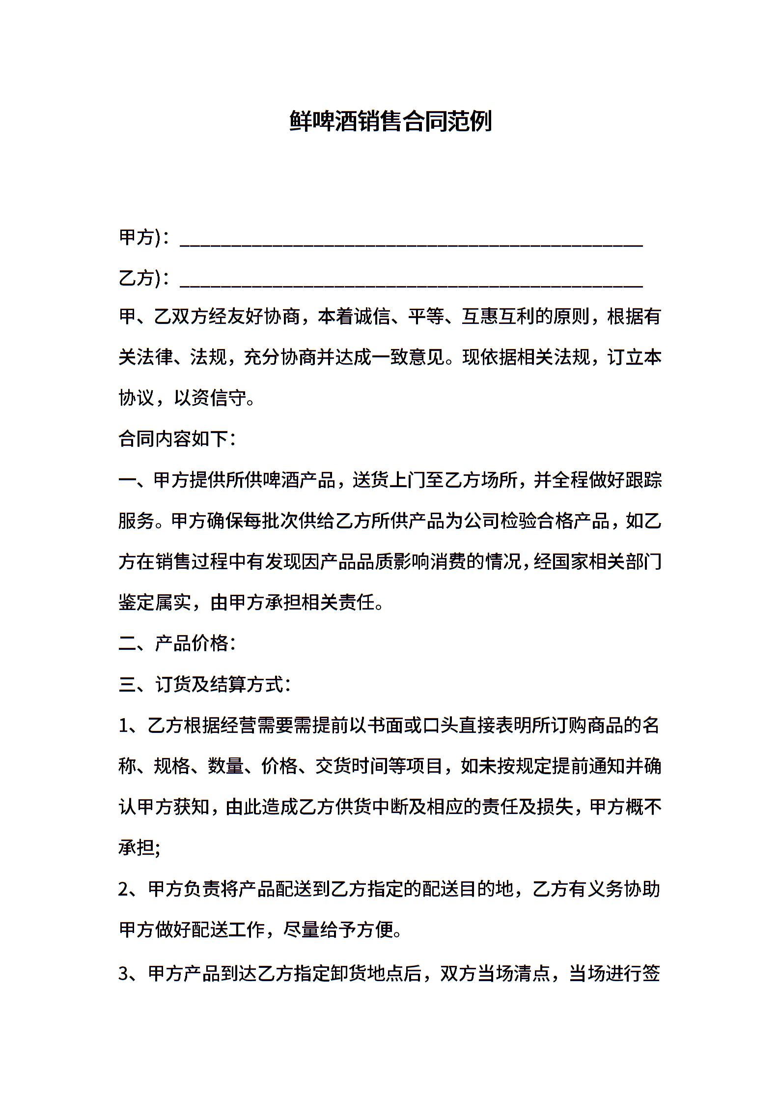 鲜啤酒销售合同范例