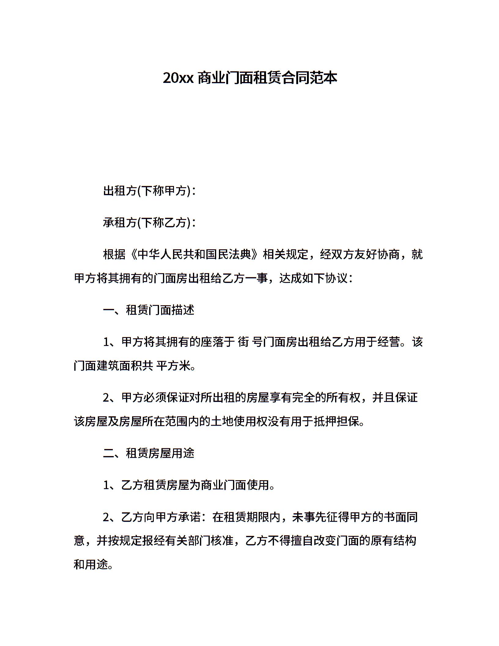 20xx商业门面租赁合同范本