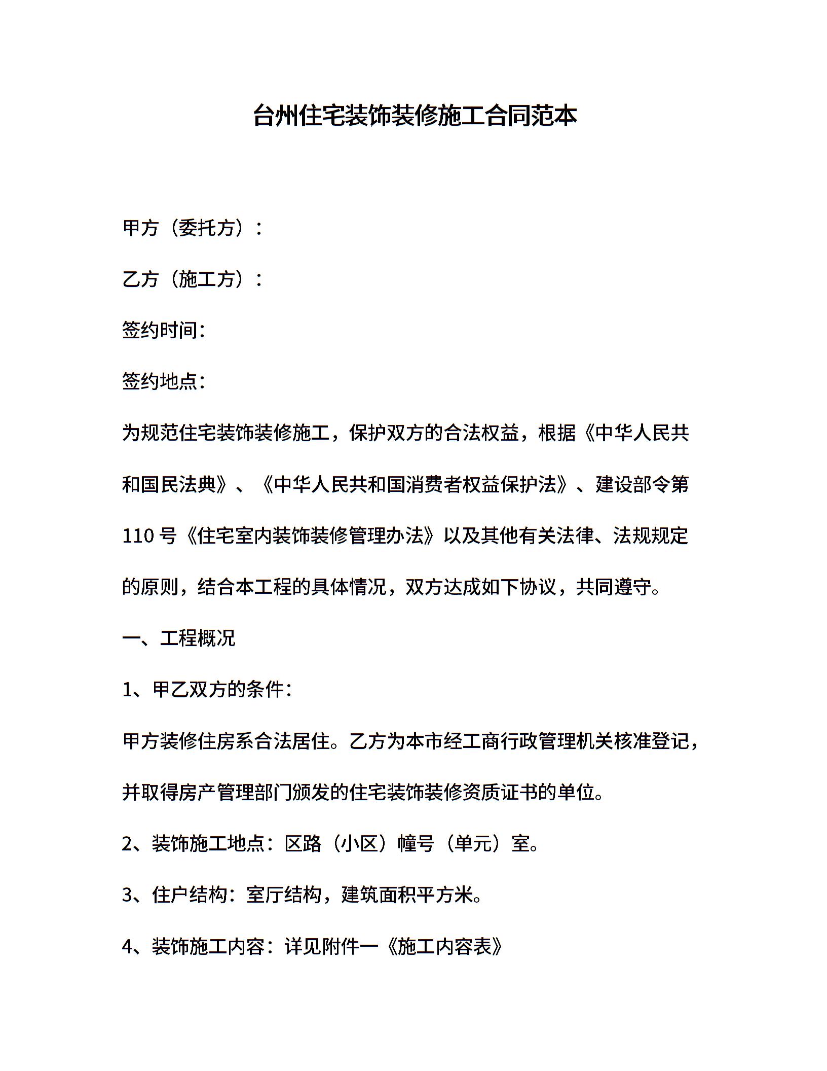 台州住宅装饰装修施工合同范本