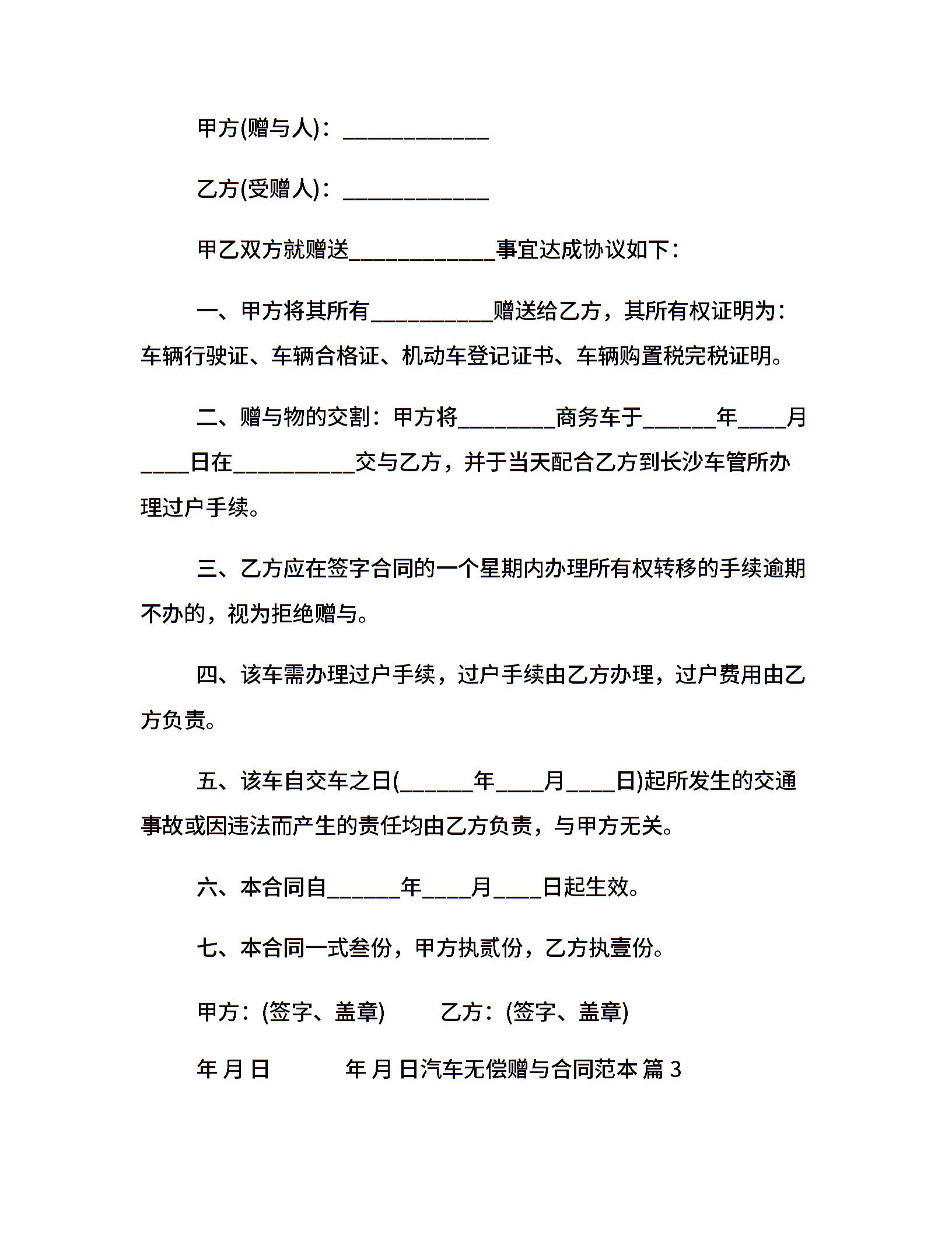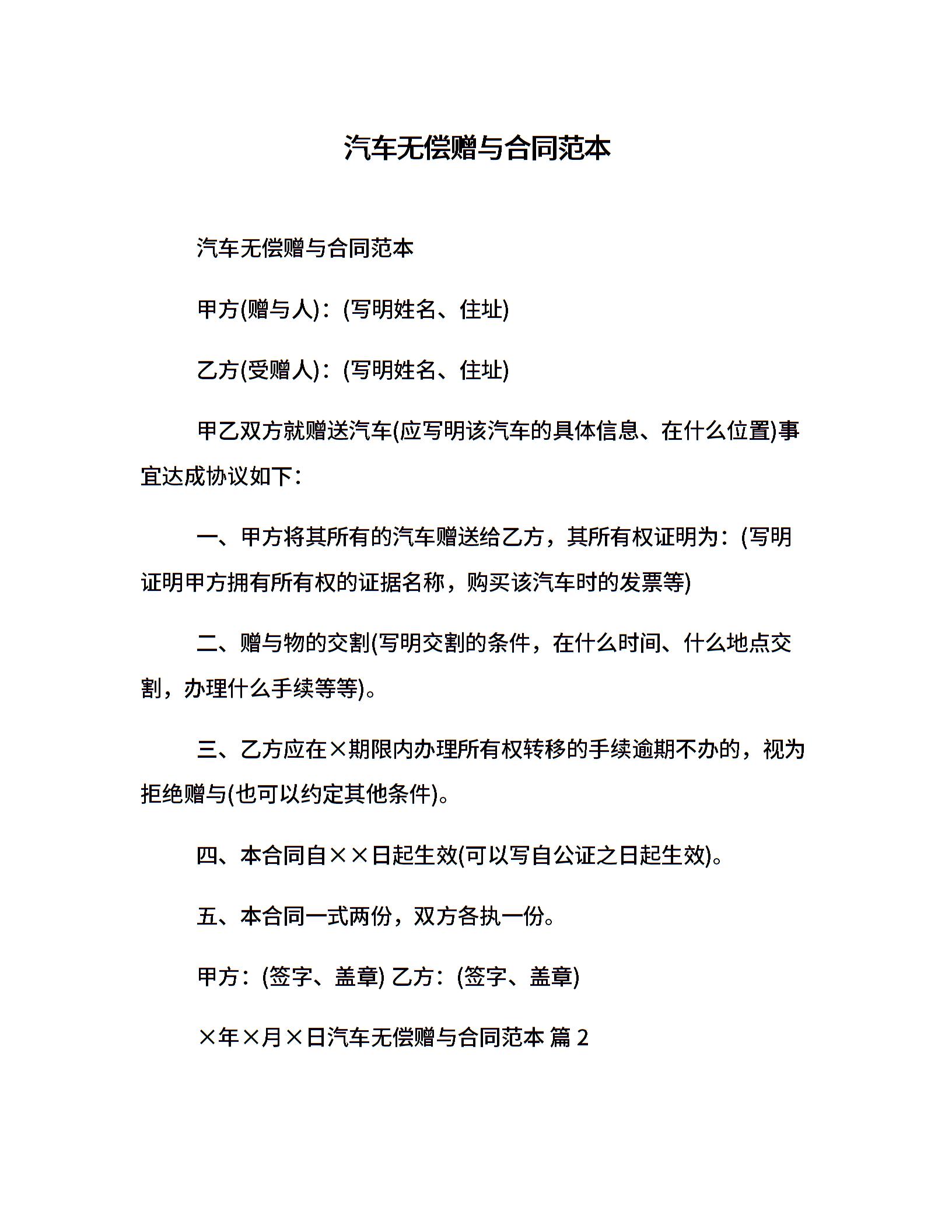 汽车无偿赠与合同范本