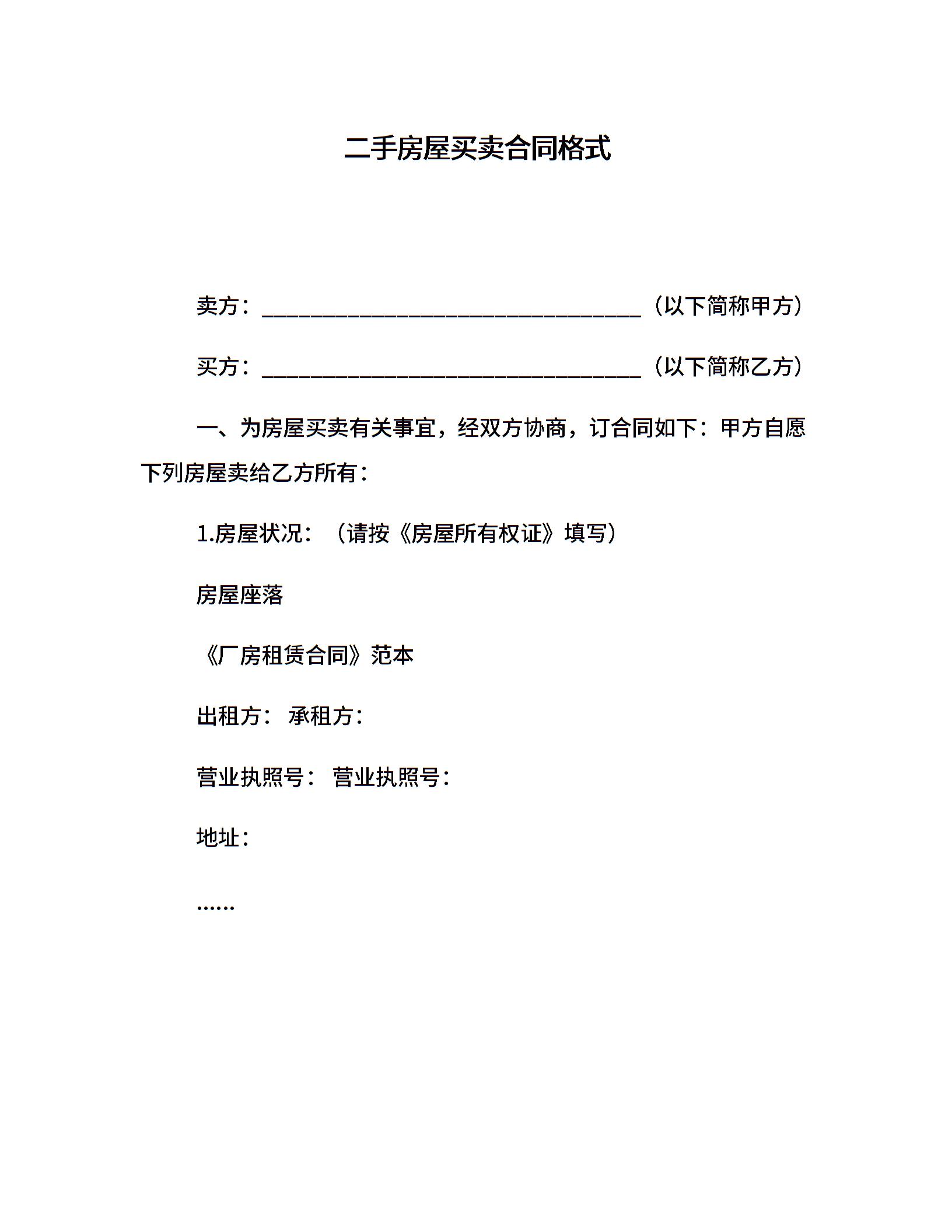 二手房屋买卖合同格式