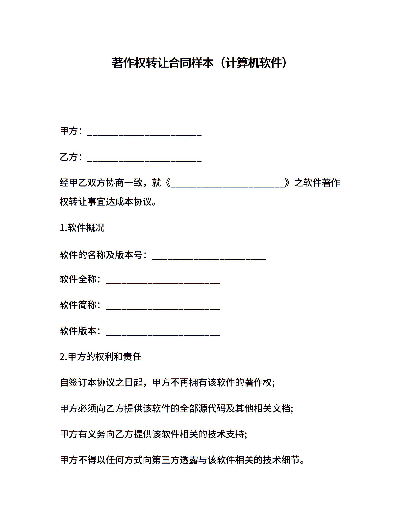 著作权转让合同样本(计算机软件)