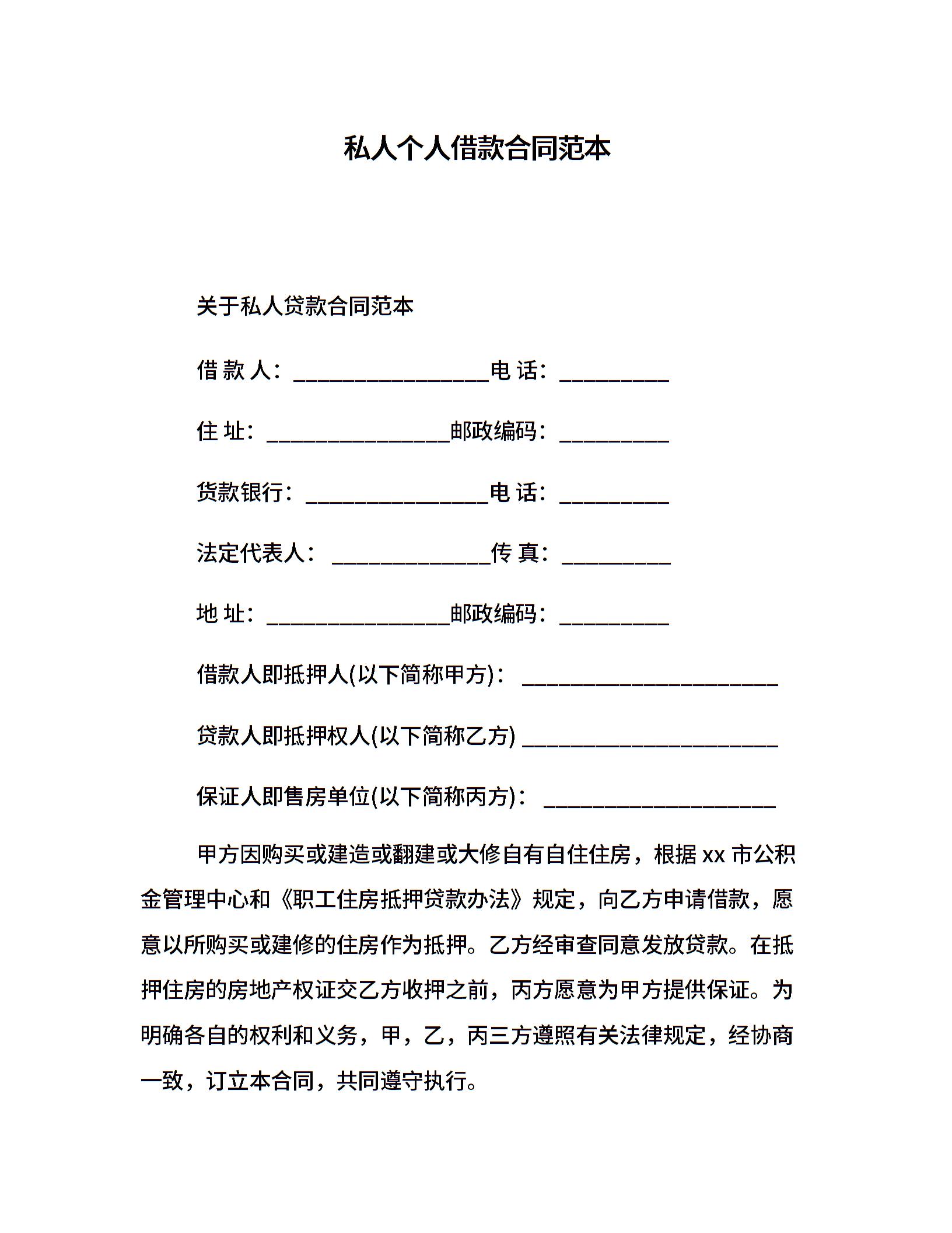 私人个人借款合同范本