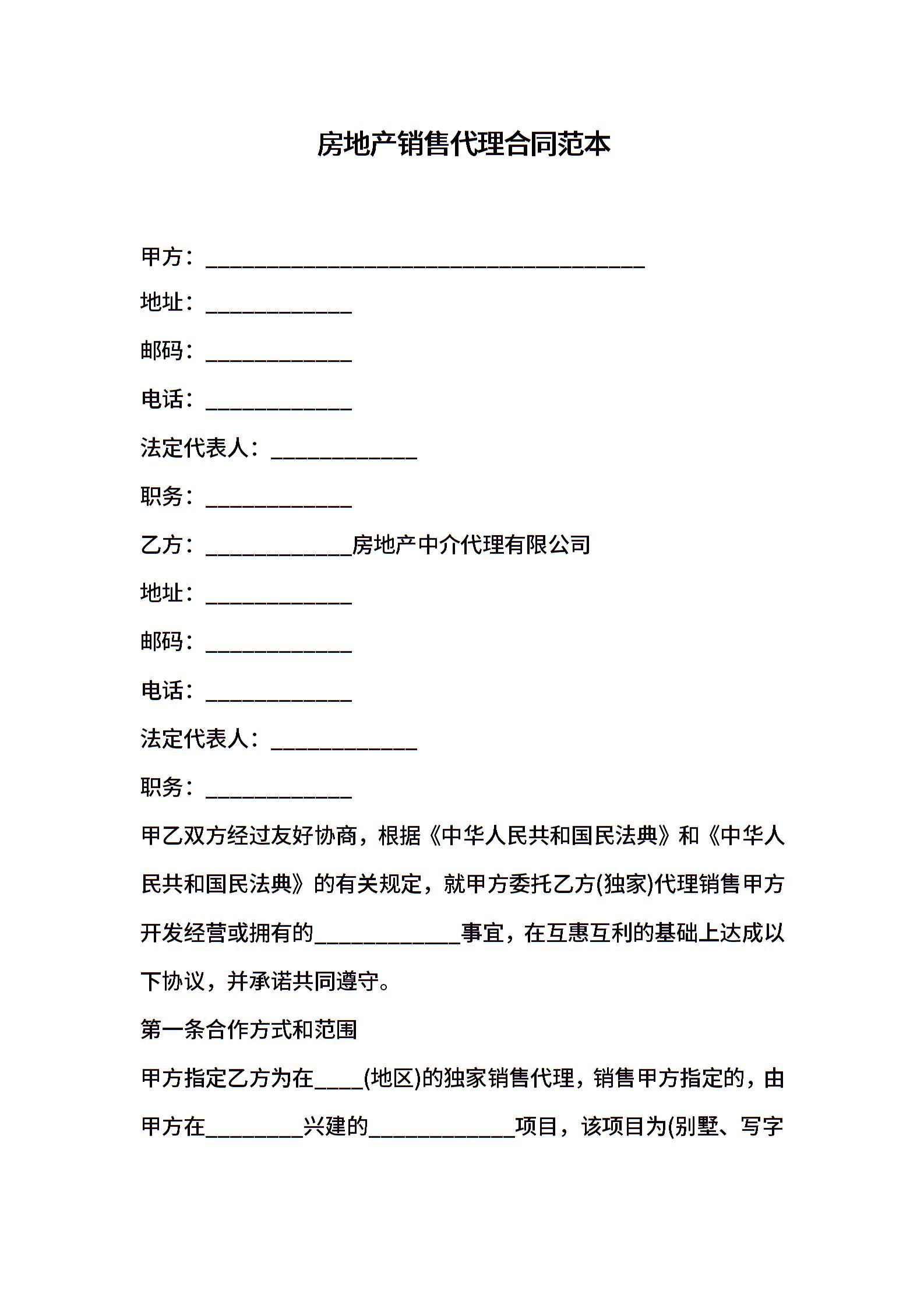 房地产销售代理合同范本