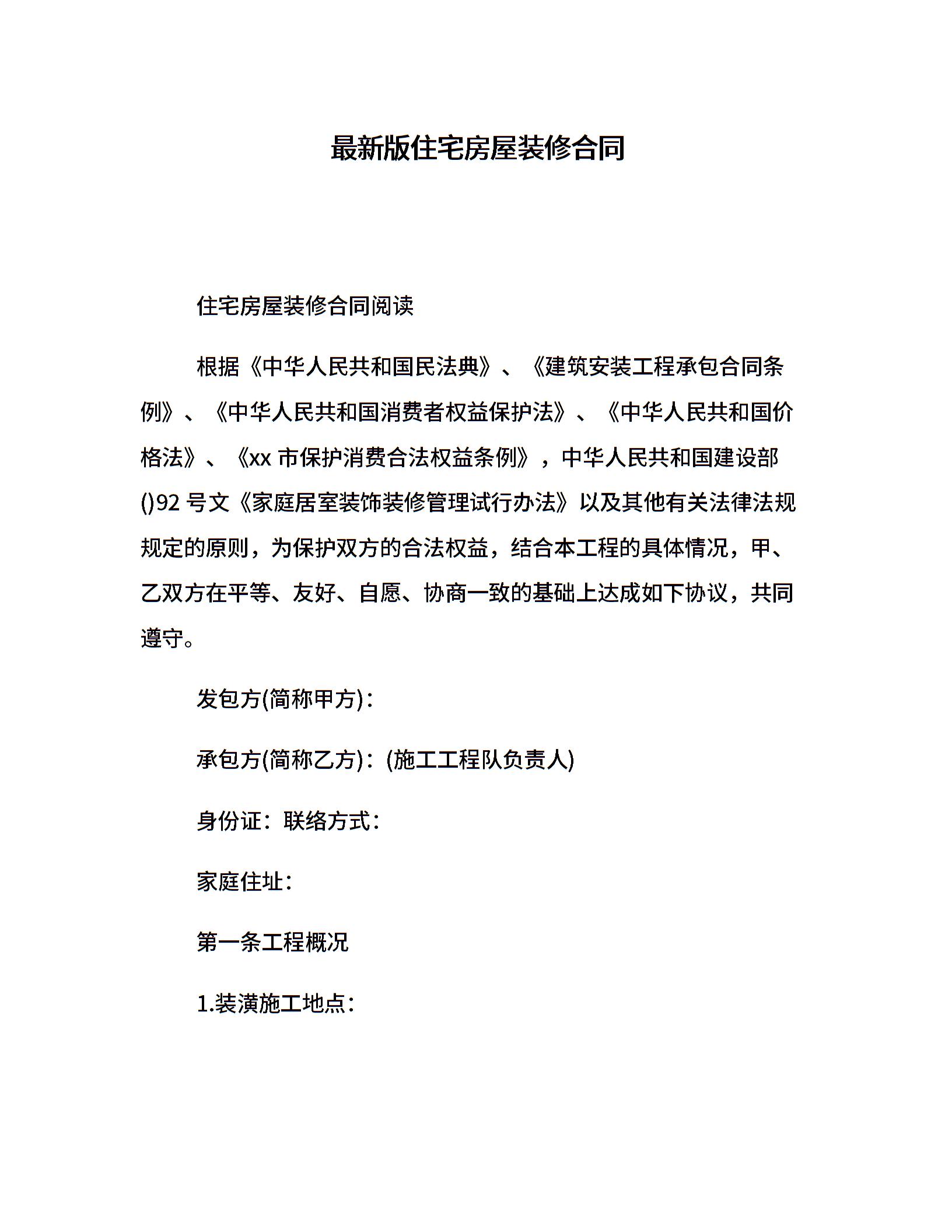 最新版住宅房屋装修合同