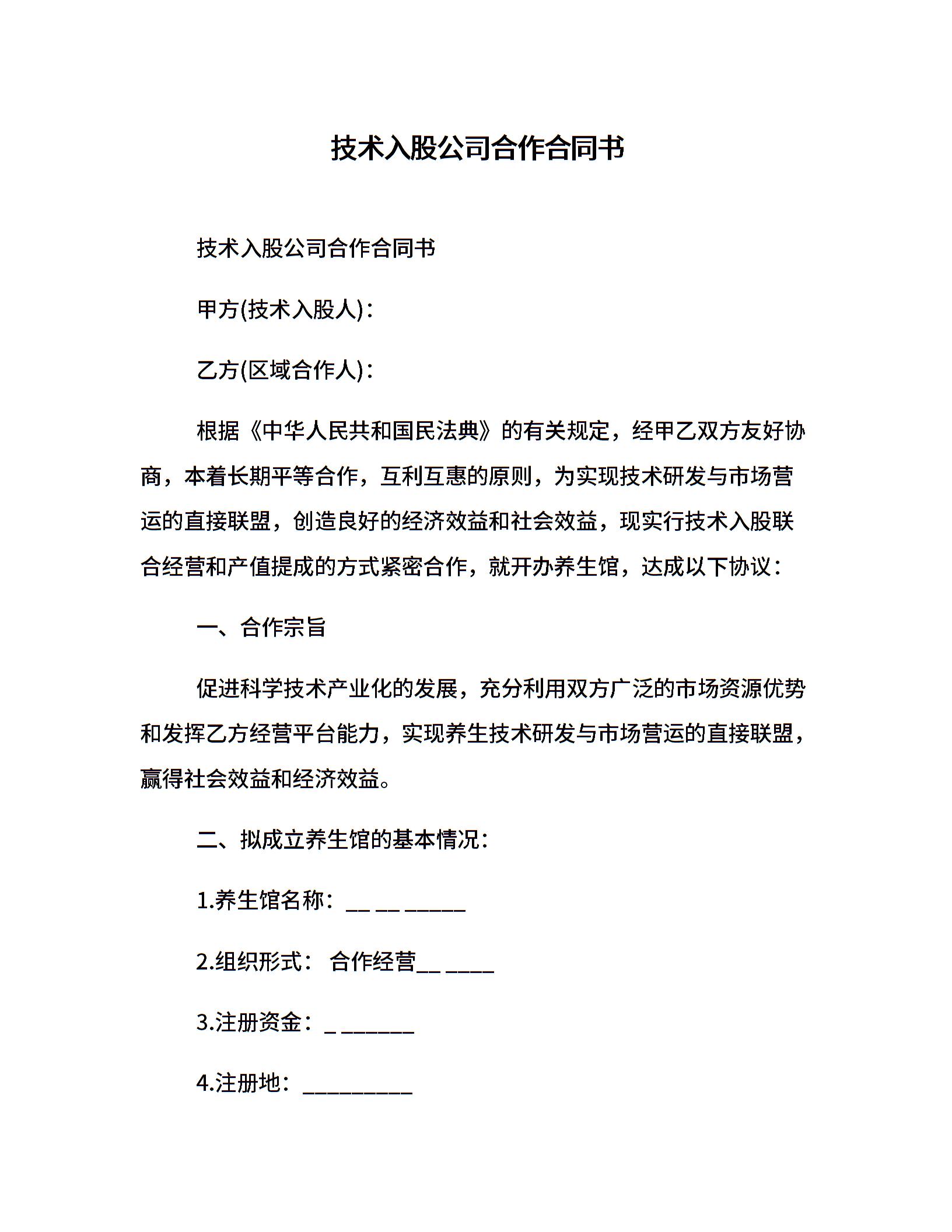 技术入股公司合作合同书