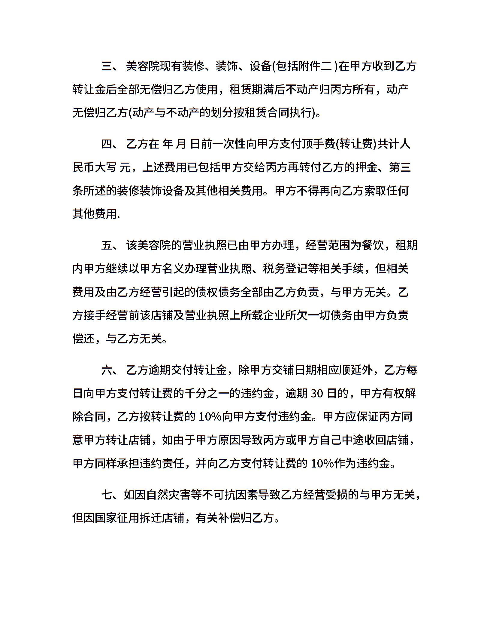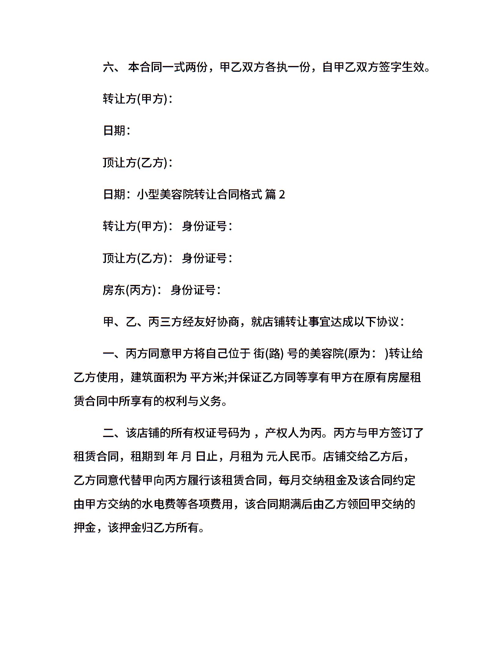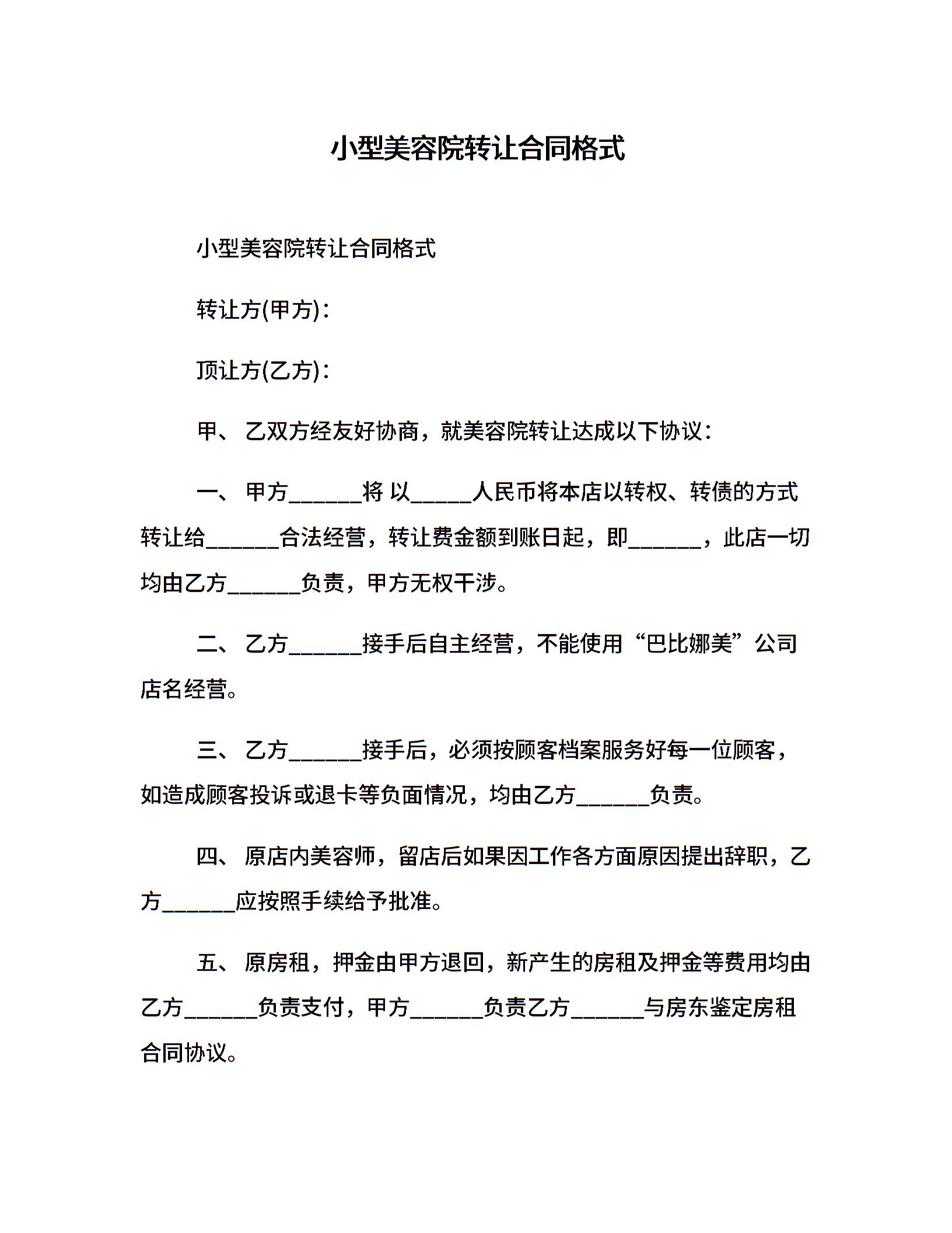 小型美容院转让合同格式