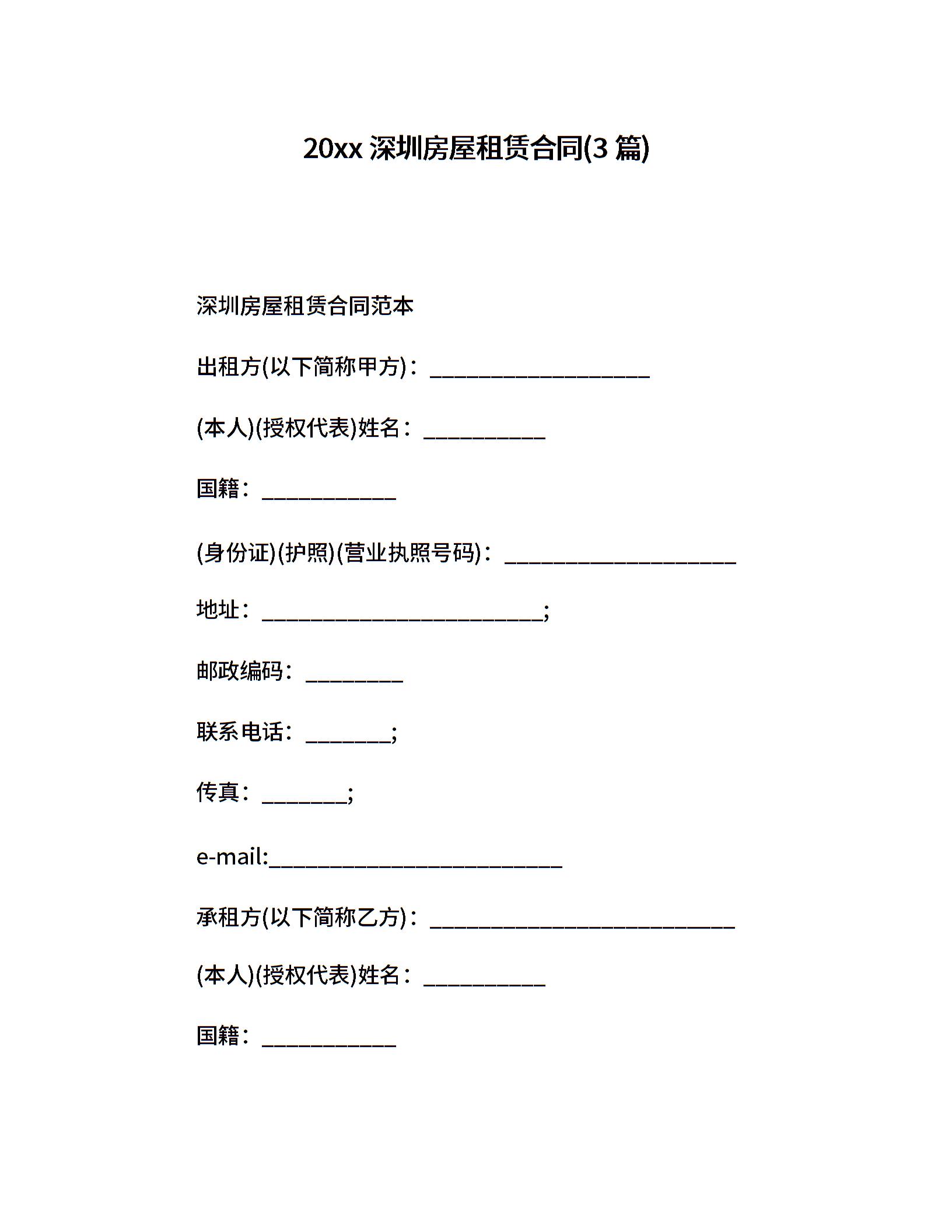 20xx深圳房屋租赁合同(3篇)
