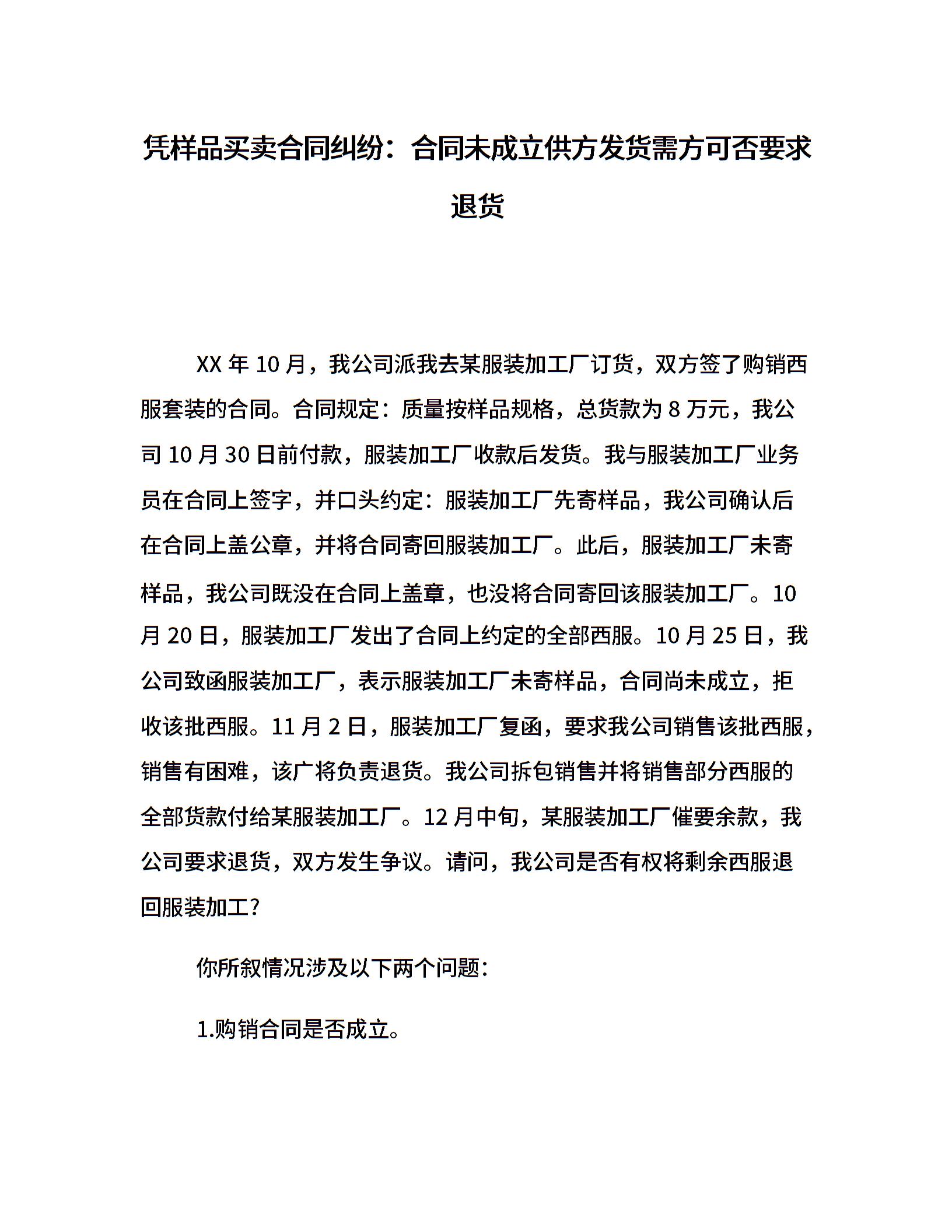 凭样品买卖合同纠纷:合同未成立供方发货需方可否要求退货